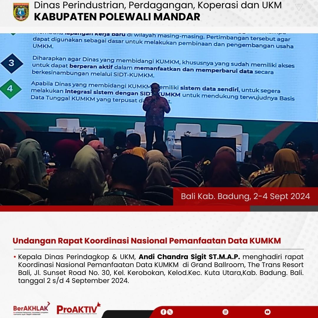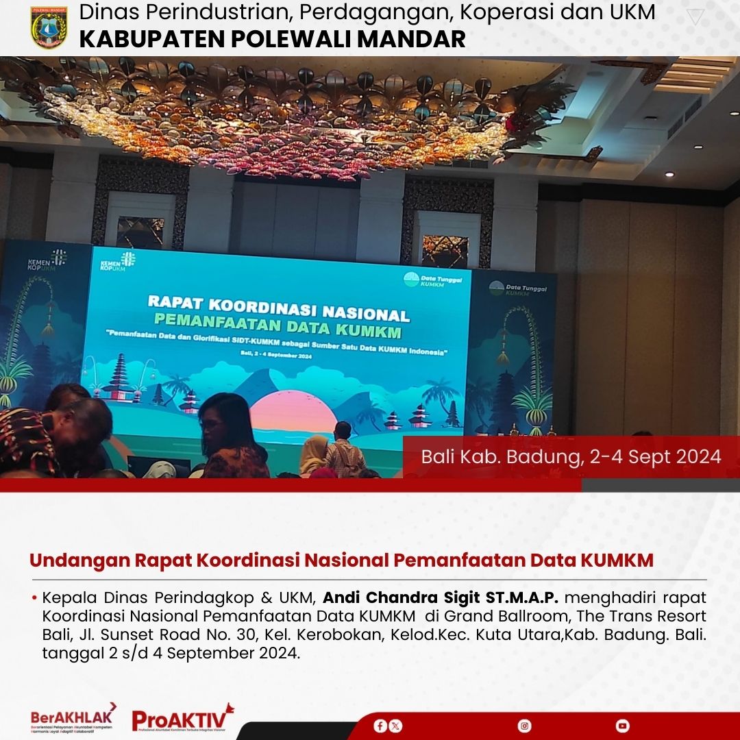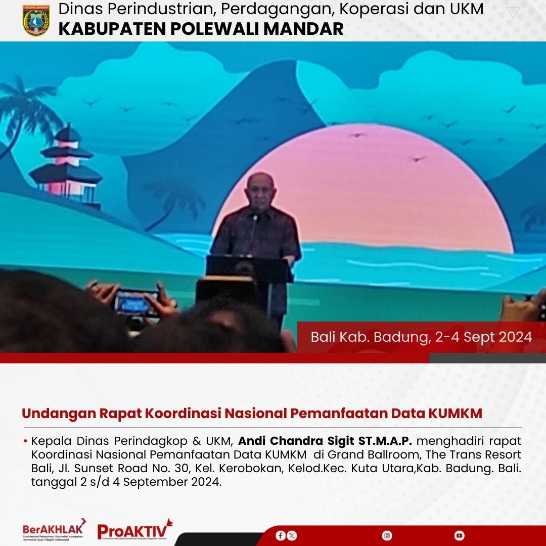 Kepala Dinas Perindagkop & UKM, Andi Chandra Sigit ST.M.A.P. menghadiri rapat Koordinasi Nasional Pemanfaatan Data KUMKM di Grand Ballroom, The Trans Resort Bali, Jl. Sunset Road No. 30, Kel. Kerobokan, Kelod.Kec. Kuta Utara,Kab. Badung. Bali. tanggal 2 s/d 4 September 2024.