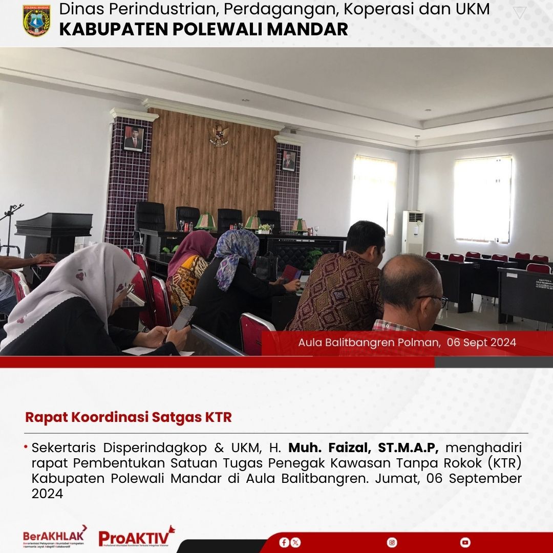 Sekertaris Disperindagkop & UKM, H. Muh. Faizal, ST.M.A.P, menghadiri rapat Pembentukan Satuan Tugas Penegak Kawasan Tanpa Rokok (KTR) Kabupaten Polewali Mandar di Aula Balitbangren. Jumat, 06 September 2024