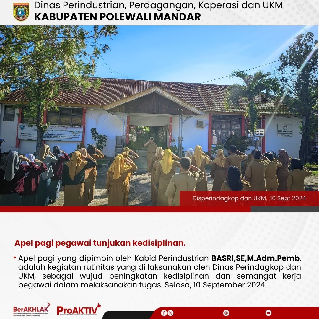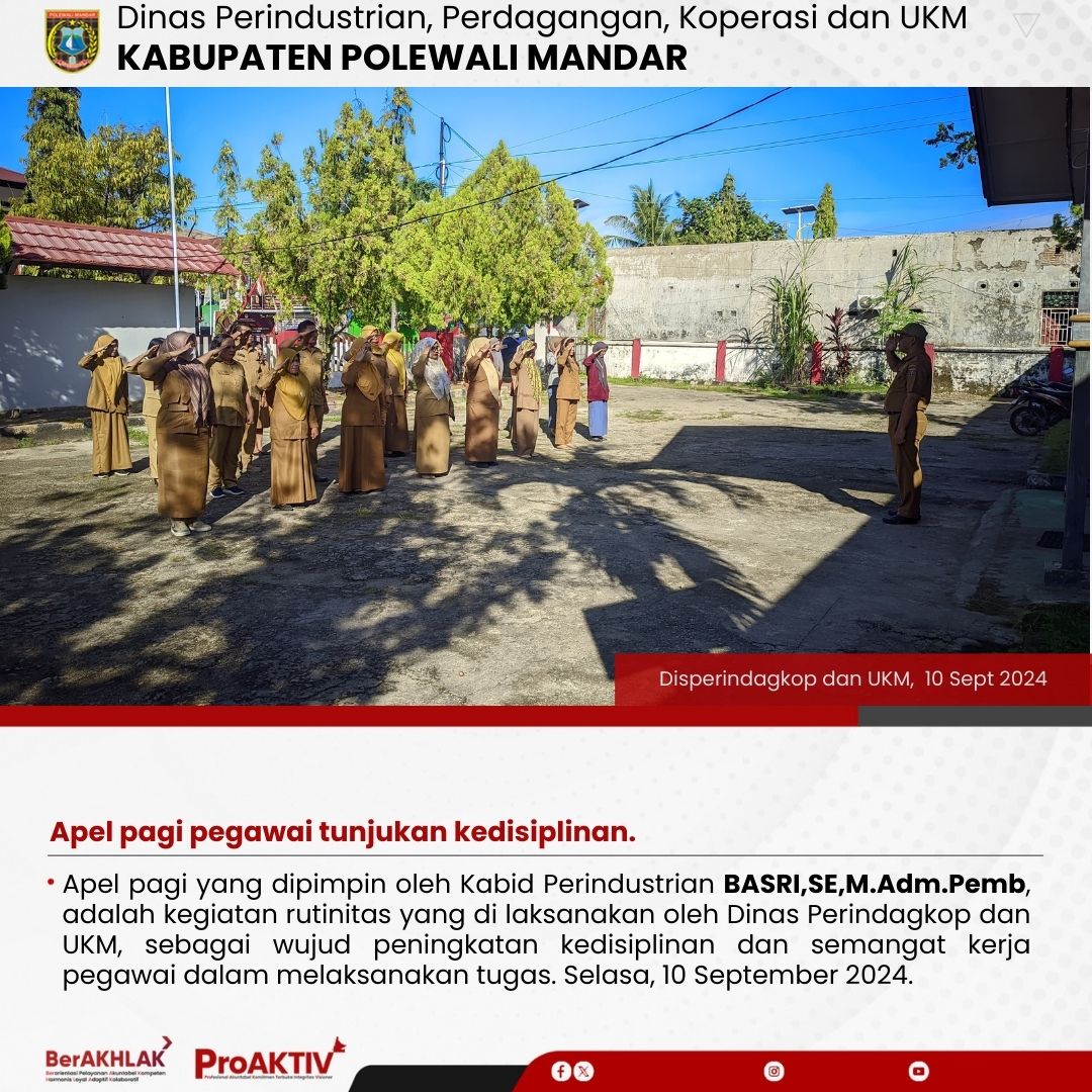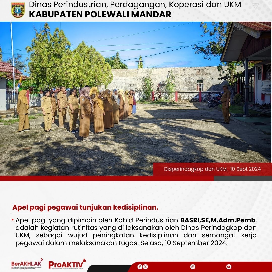 Apel pagi yang dipimpin oleh Kabid Perindustrian BASRI,SE,M.Adm.Pemb, adalah kegiatan rutinitas yang di laksanakan oleh Dinas Perindagkop dan UKM, sebagai wujud peningkatan kedisiplinan dan semangat kerja pegawai dalam melaksanakan tugas. Selasa, 10 September 2024.