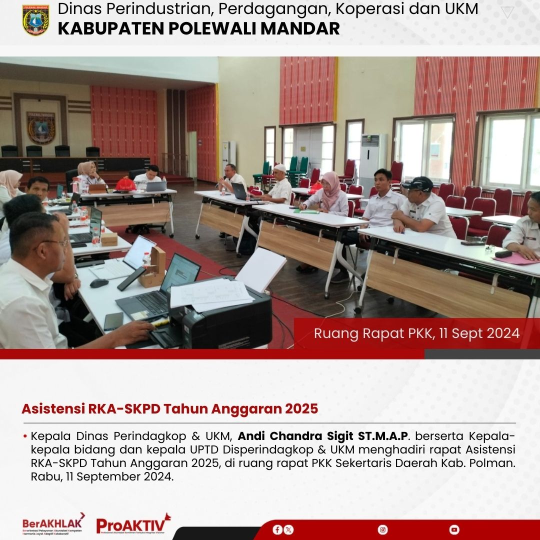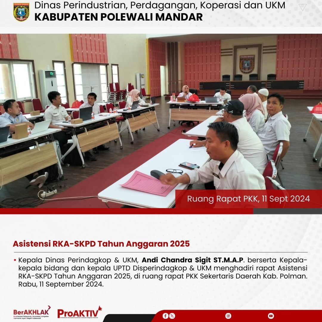 Kepala Dinas Perindagkop & UKM, Andi Chandra Sigit ST.M.A.P. berserta Kepala-kepala bidang dan kepala UPTD Disperindagkop & UKM menghadiri rapat Asistensi RKA-SKPD Tahun Anggaran 2025, di ruang rapat PKK Sekertaris Daerah Kab. Polman. Rabu, 11 September 2024.