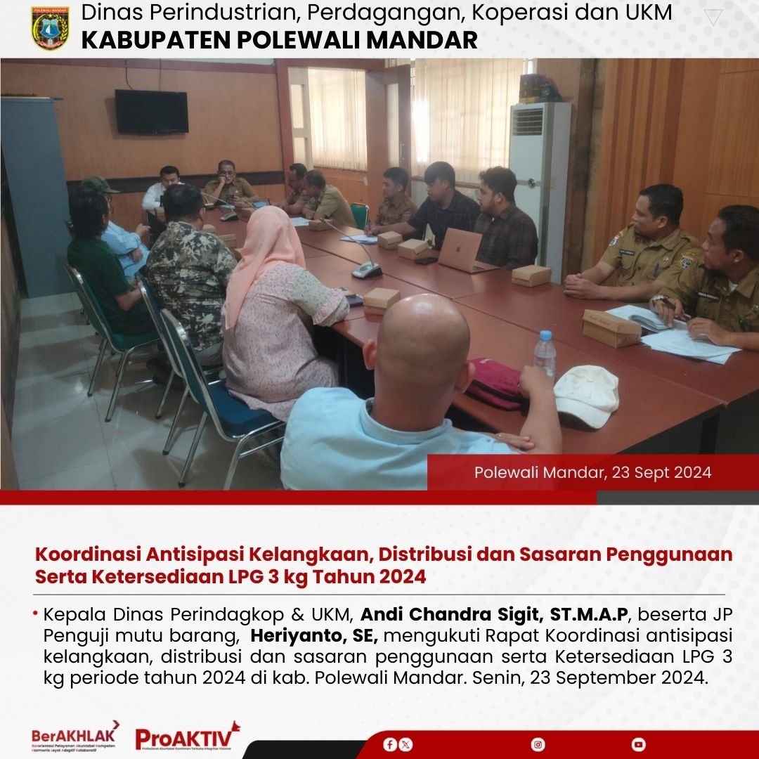 Kepala Dinas Perindagkop & UKM, Andi Chandra Sigit, ST.M.A.P, beserta JP Penguji mutu barang, Heriyanto, SE, mengukuti Rapat Koordinasi antisipasi kelangkaan, distribusi dan sasaran penggunaan serta Ketersediaan LPG 3 kg periode tahun 2024 di kab. Polewali Mandar. Senin, 23 September 2024.