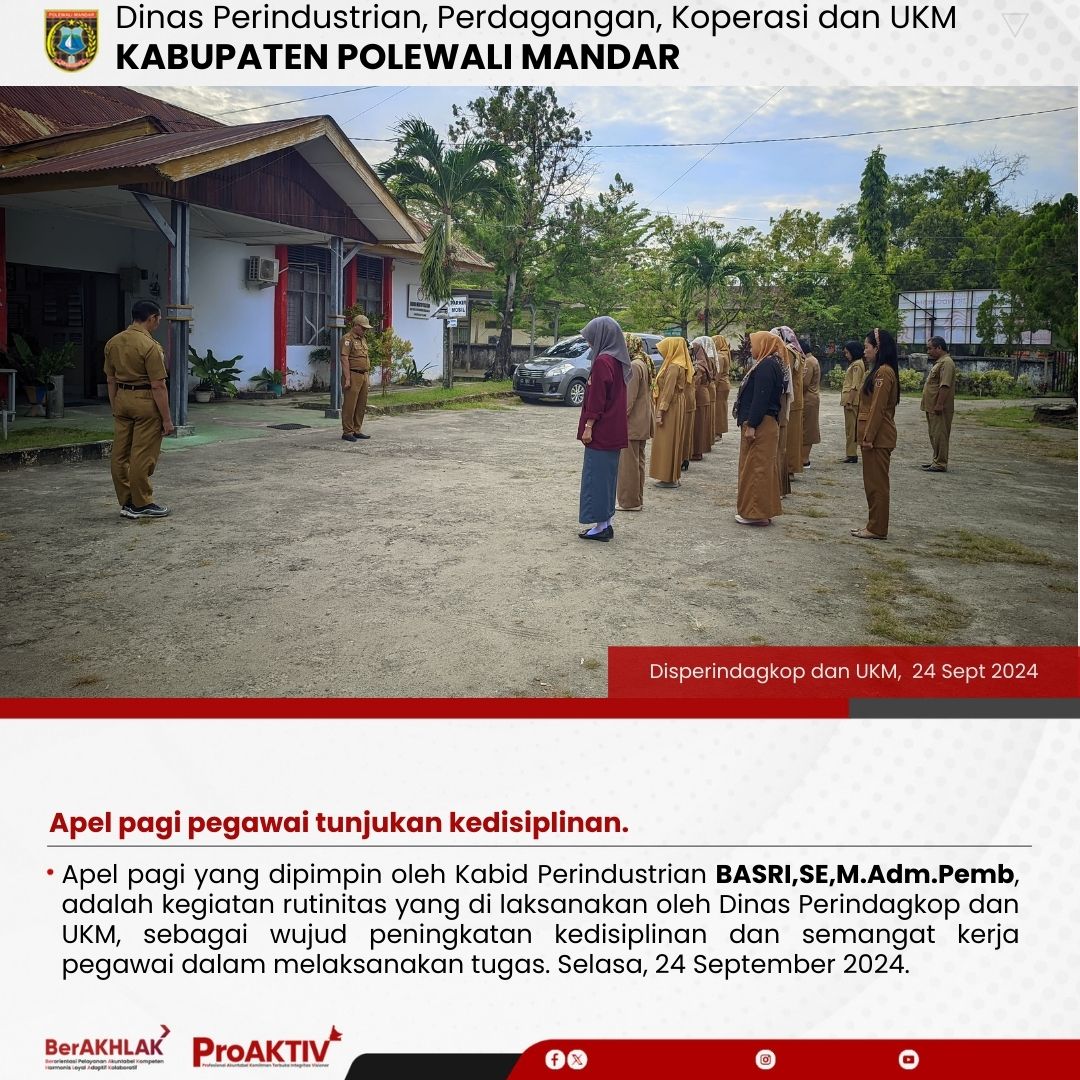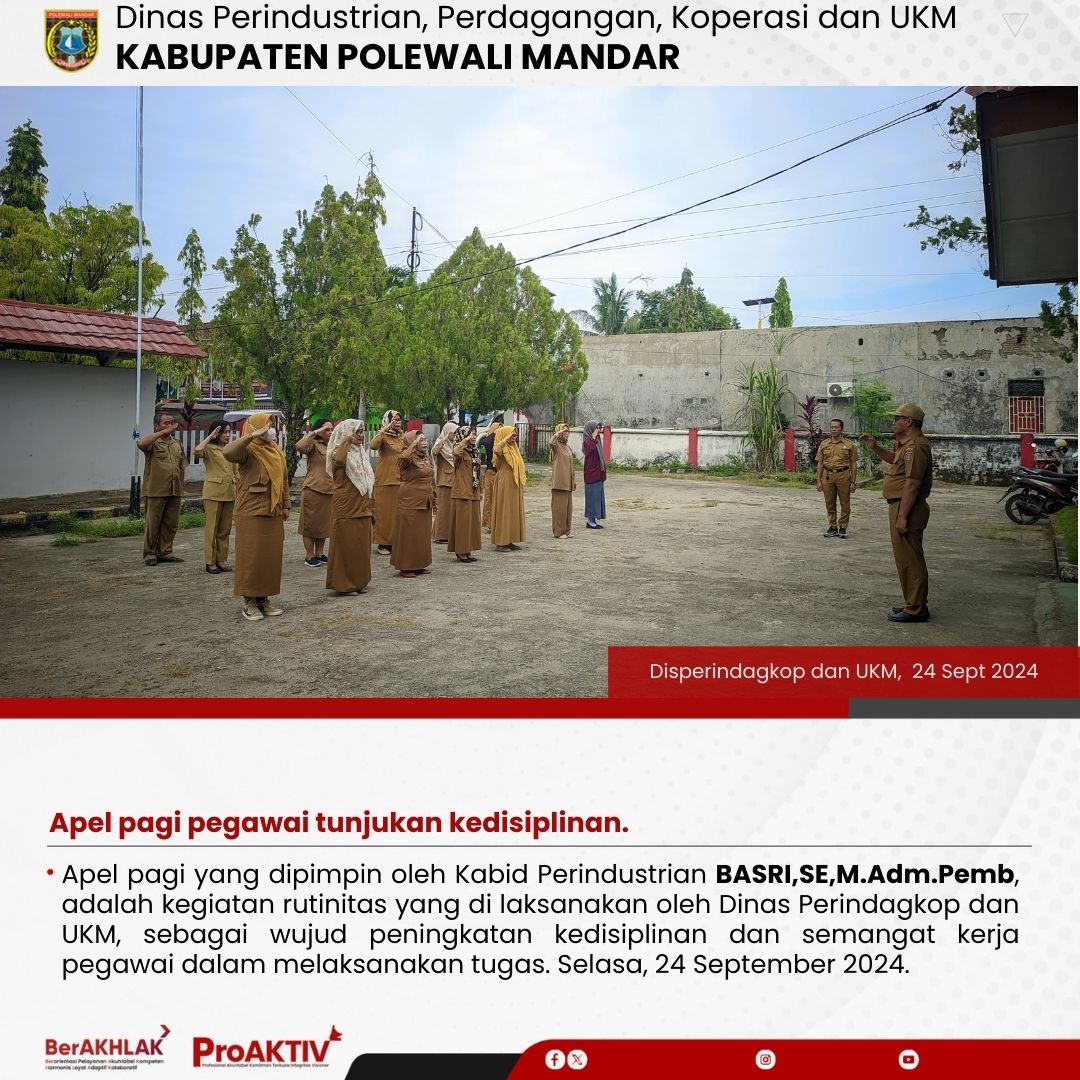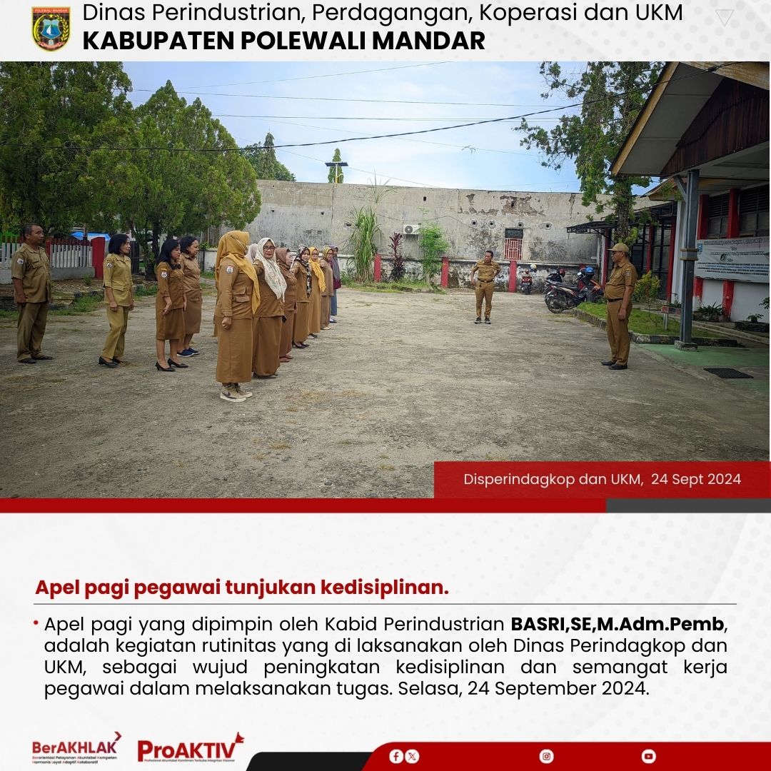 Apel pagi yang dipimpin oleh Kabid Perindustrian BASRI,SE,M.Adm.Pemb, adalah kegiatan rutinitas yang di laksanakan oleh Dinas Perindagkop dan UKM, sebagai wujud peningkatan kedisiplinan dan semangat kerja pegawai dalam melaksanakan tugas. Selasa, 24 September 2024.