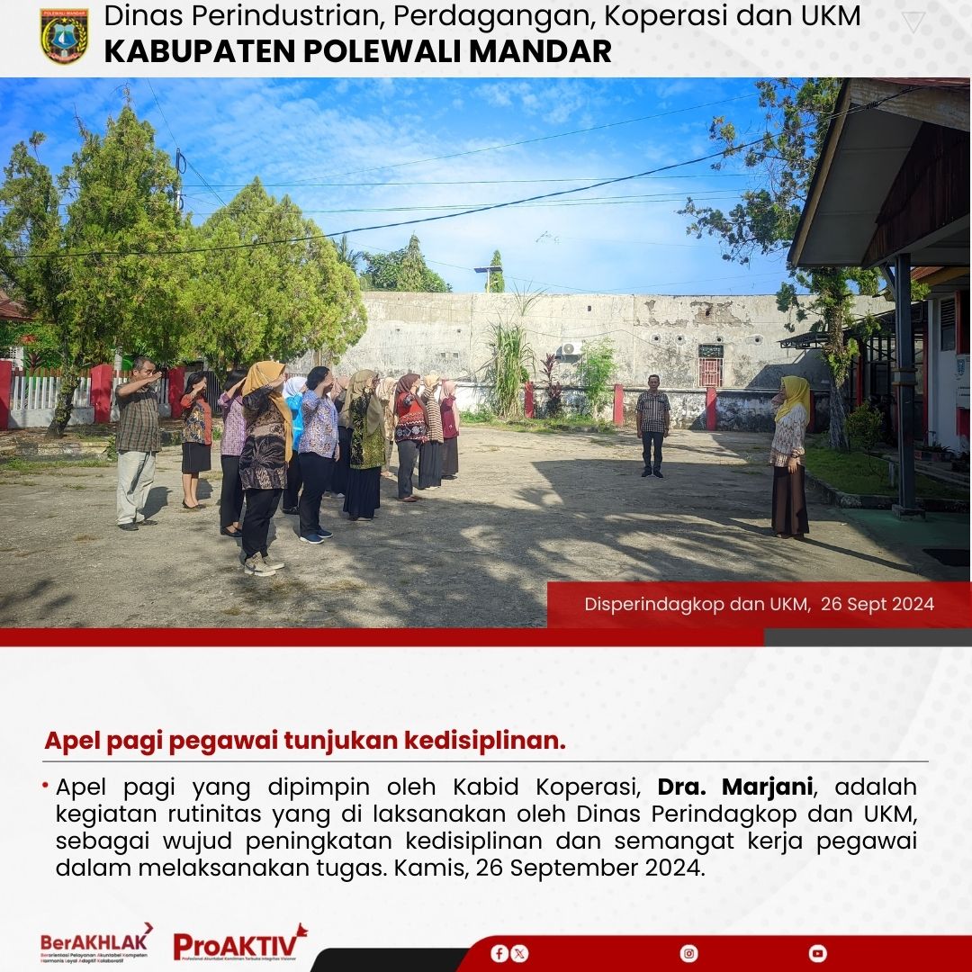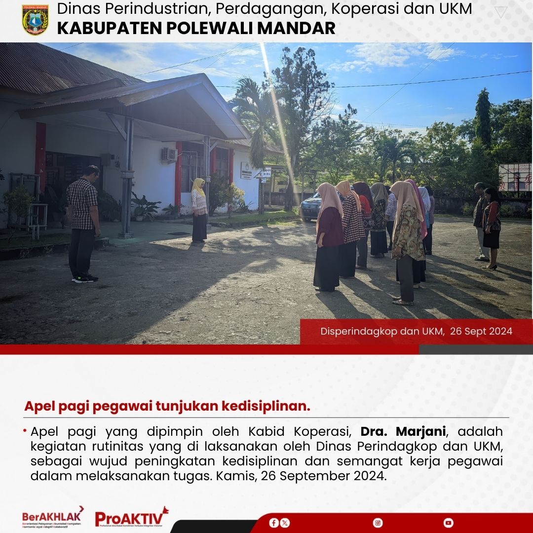 Apel pagi yang dipimpin oleh Kabid Koperasi, Dra. Marjani, adalah kegiatan rutinitas yang di laksanakan oleh Dinas Perindagkop dan UKM, sebagai wujud peningkatan kedisiplinan dan semangat kerja pegawai dalam melaksanakan tugas. Kamis, 26 September 2024.