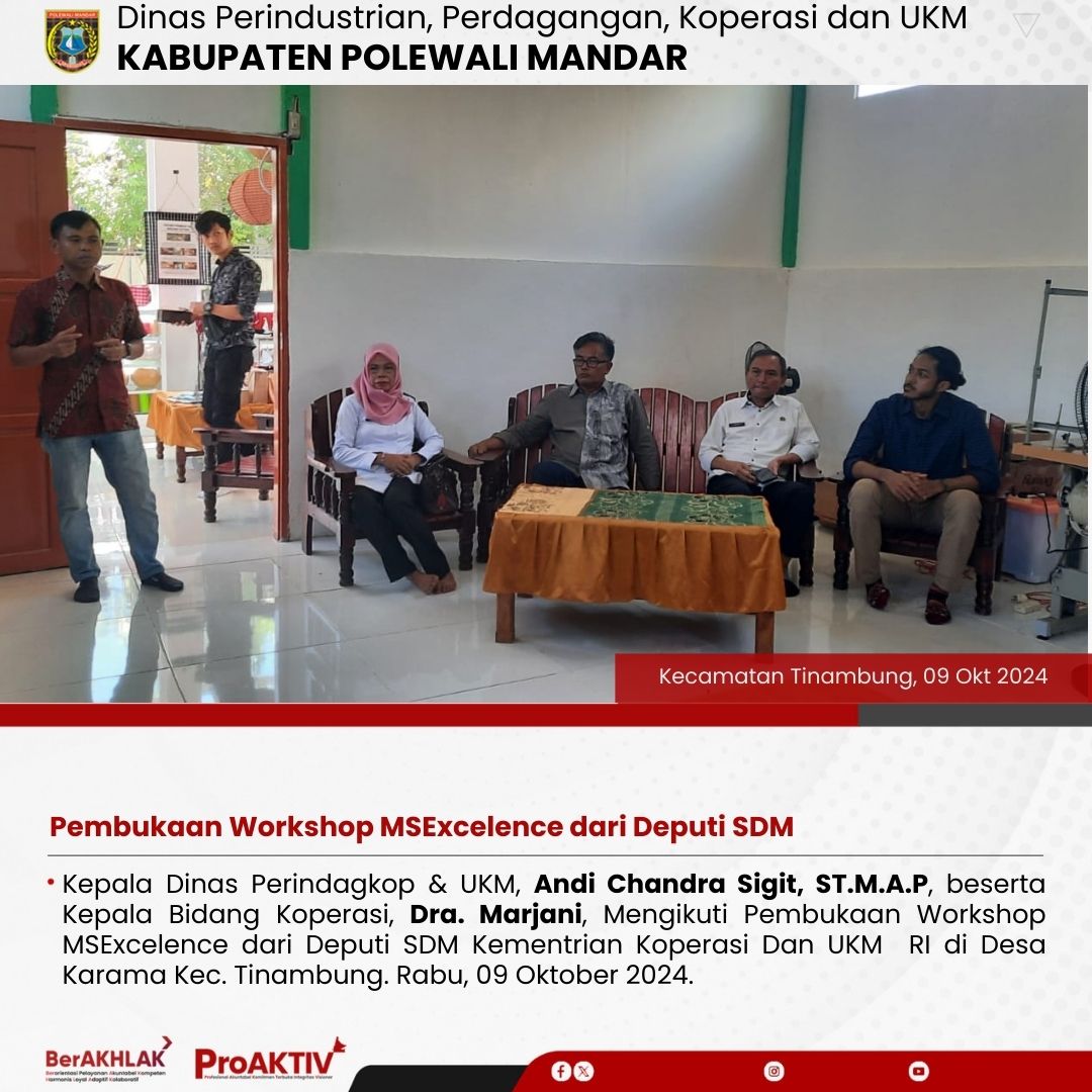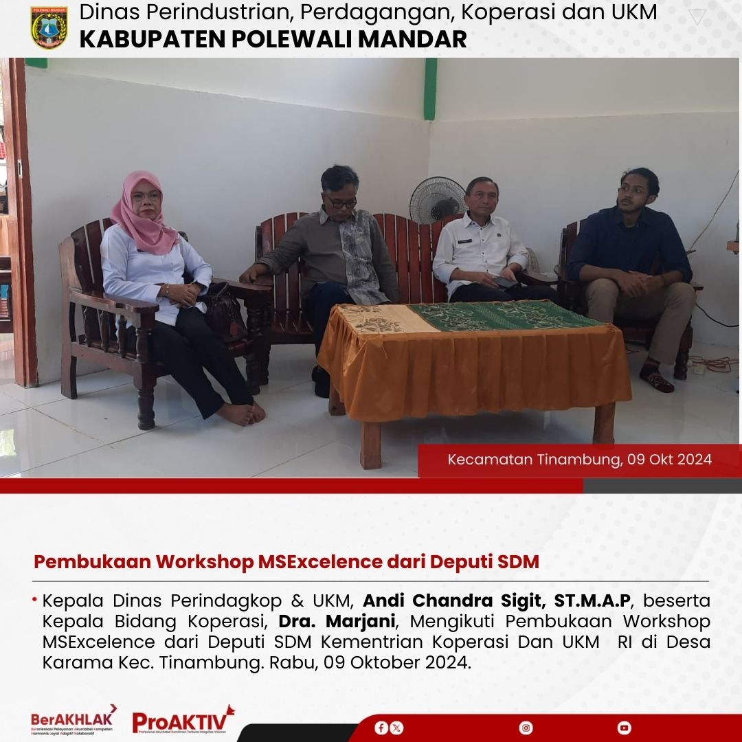 Kepala Dinas Perindagkop & UKM, Andi Chandra Sigit, ST.M.A.P, beserta Kepala Bidang Koperasi, Dra. Marjani, Mengikuti Pembukaan Workshop MSExcelence dari Deputi SDM Kementrian Koperasi Dan UKM RI di Desa Karama Kec. Tinambung. Rabu, 09 Oktober 2024.