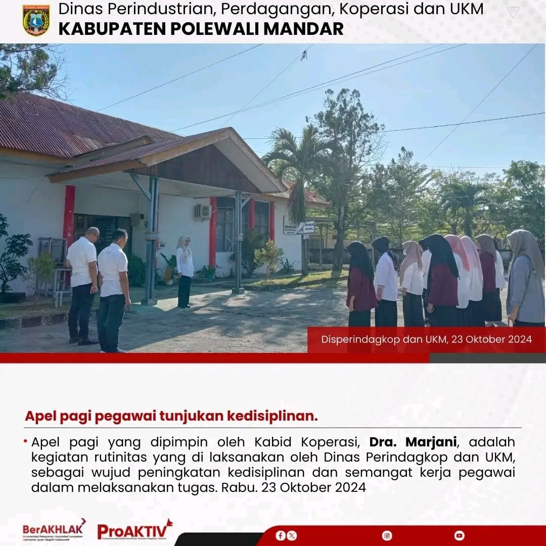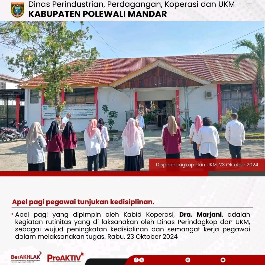 Dinas Perindustrian, Perdagangan, Koperasi dan UKM Kabupaten Polewali Mandar kembali menggelar kegiatan Jumat Bersih pada hari ini. Seluruh pejabat struktural, staf, hingga pegawai non-ASN terlibat aktif dalam menjaga kebersihan lingkungan kantor. Jumat, 07 November 2025...