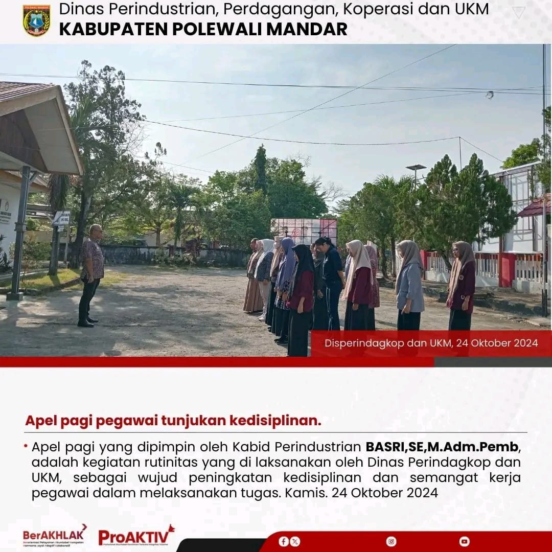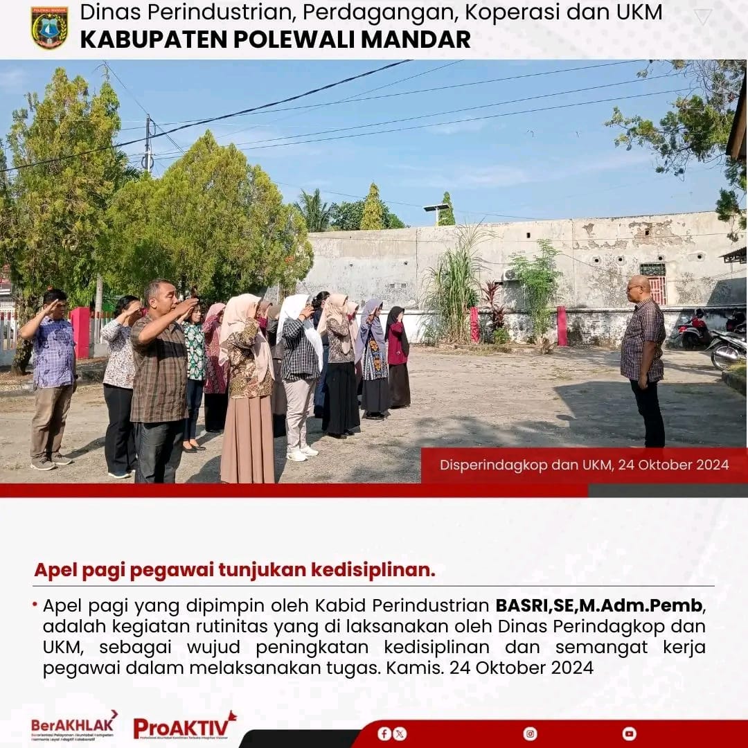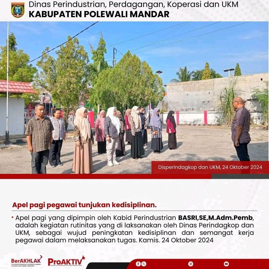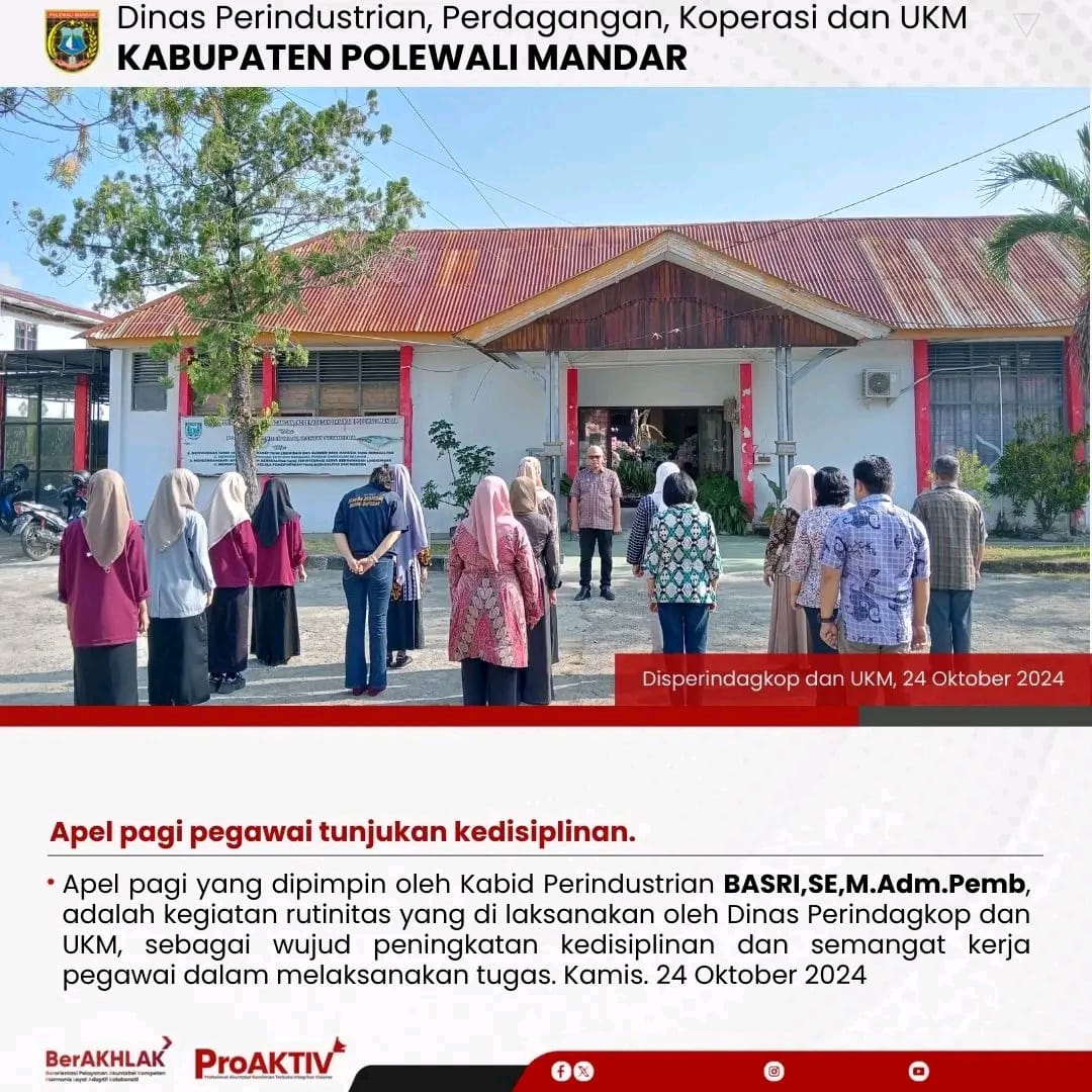 Dinas Perindustrian, Perdagangan, Koperasi dan UKM Kabupaten Polewali Mandar kembali menggelar kegiatan Jumat Bersih pada hari ini. Seluruh pejabat struktural, staf, hingga pegawai non-ASN terlibat aktif dalam menjaga kebersihan lingkungan kantor. Jumat, 07 November 2025...
