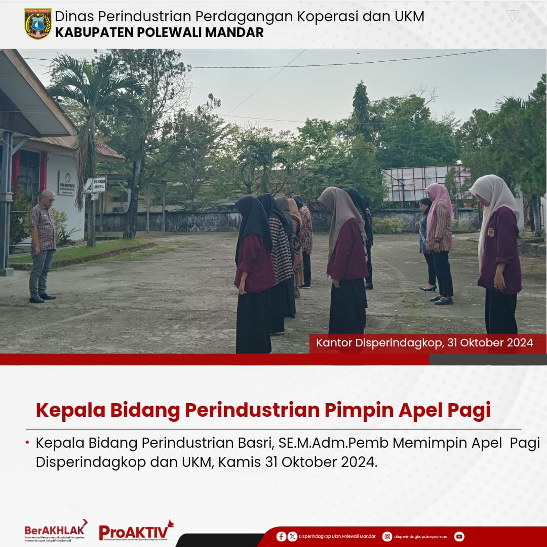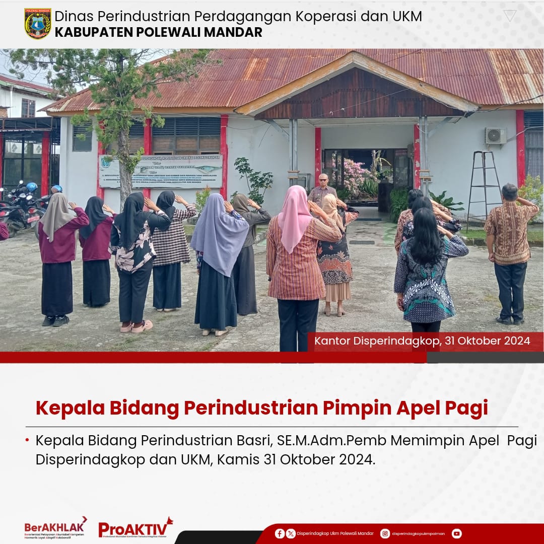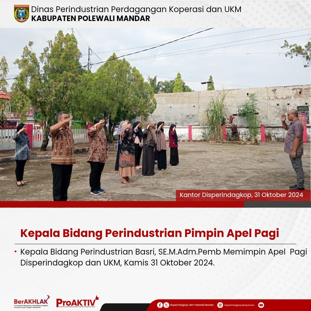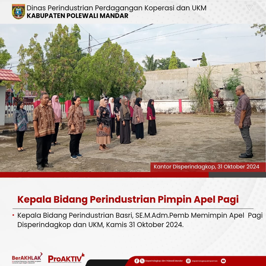 Dinas Perindustrian, Perdagangan, Koperasi dan UKM Kabupaten Polewali Mandar kembali menggelar kegiatan Jumat Bersih pada hari ini. Seluruh pejabat struktural, staf, hingga pegawai non-ASN terlibat aktif dalam menjaga kebersihan lingkungan kantor. Jumat, 07 November 2025...