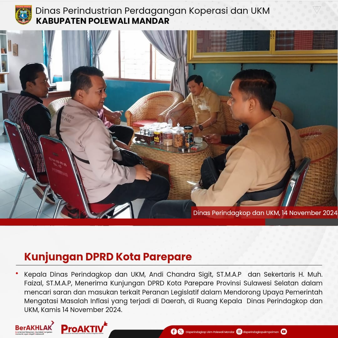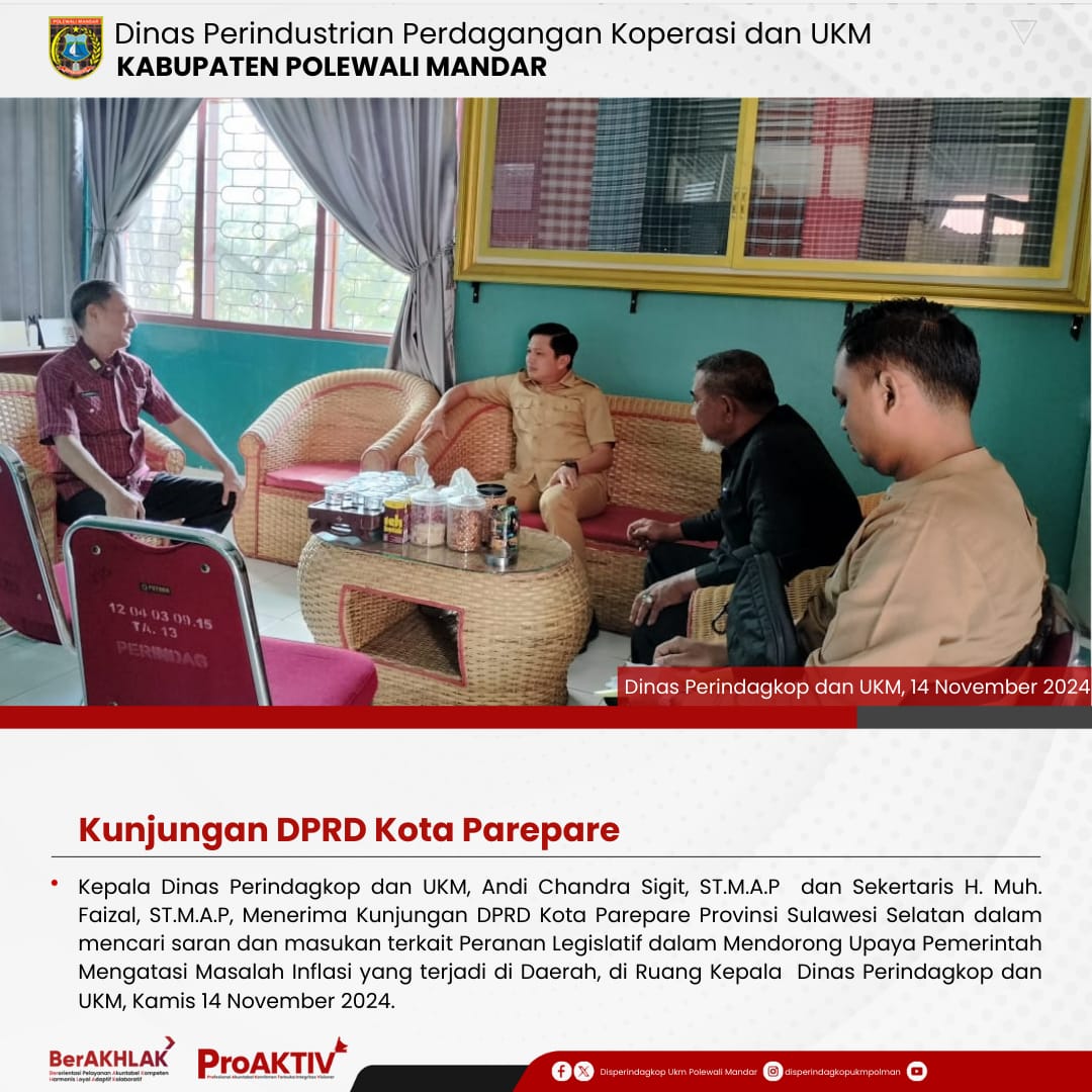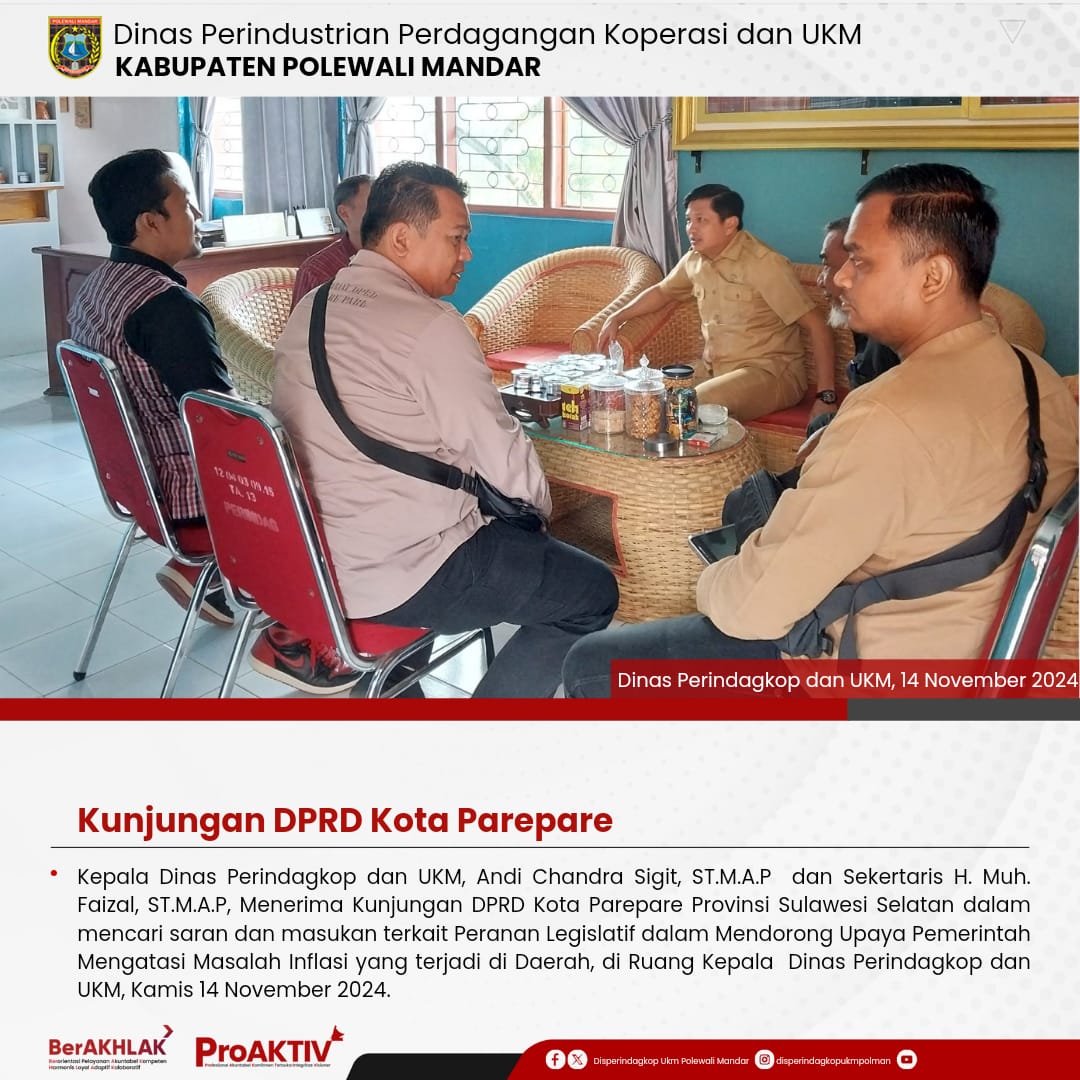 Kepala Dinas Perindustrian, Perdagangan, Koperasi dan UKM Kabupaten Polewali Mandar, Andi Chandra Sigit, ST., M.A.P beserta Kepala Bidang Koperasi, Nabil Wijdan Al Hamdani, S.STP. M.Si menghadiri undangan Rapat Konsolidasi Koperasi Desa Merah Putih yang berlangsung di Hotel Maleo pada tanggal 6 hingga 8 November 2025. Kegiatan ini dilaksanakan dalam rangka memperkuat koordinasi dan sinergitas antar lembaga dalam pengembangan sektor koperasi dan usaha kecil menengah di daerah....