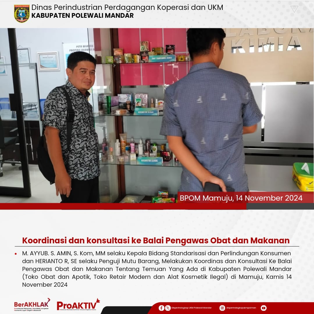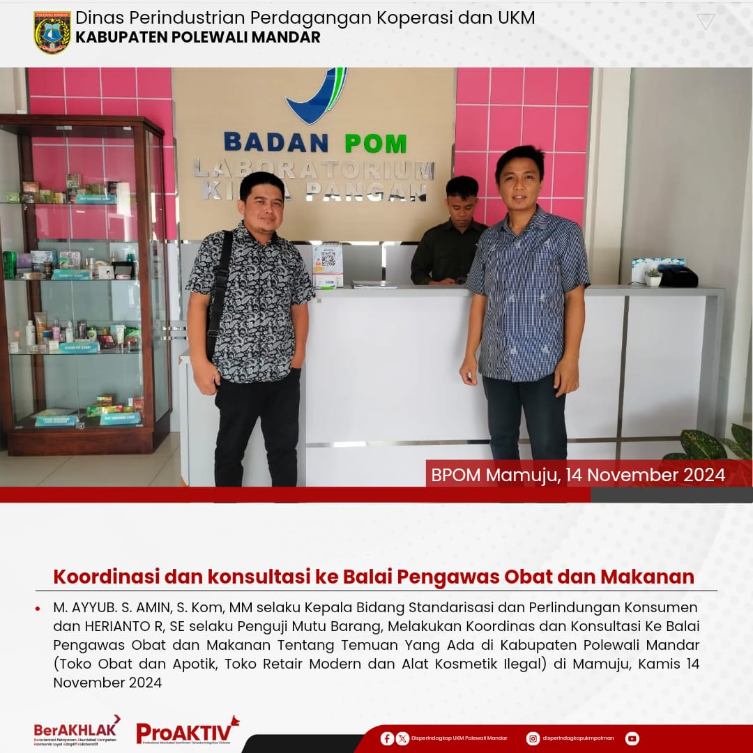 Kepala Dinas Perindustrian, Perdagangan, Koperasi dan UKM Kabupaten Polewali Mandar, Andi Chandra Sigit, ST., M.A.P beserta Kepala Bidang Koperasi, Nabil Wijdan Al Hamdani, S.STP. M.Si menghadiri undangan Rapat Konsolidasi Koperasi Desa Merah Putih yang berlangsung di Hotel Maleo pada tanggal 6 hingga 8 November 2025. Kegiatan ini dilaksanakan dalam rangka memperkuat koordinasi dan sinergitas antar lembaga dalam pengembangan sektor koperasi dan usaha kecil menengah di daerah....