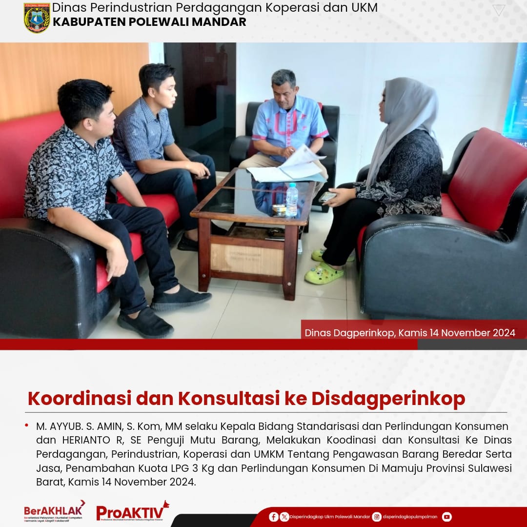 Kepala Dinas Perindustrian, Perdagangan, Koperasi dan UKM Kabupaten Polewali Mandar, Andi Chandra Sigit, ST., M.A.P beserta Kepala Bidang Koperasi, Nabil Wijdan Al Hamdani, S.STP. M.Si menghadiri undangan Rapat Konsolidasi Koperasi Desa Merah Putih yang berlangsung di Hotel Maleo pada tanggal 6 hingga 8 November 2025. Kegiatan ini dilaksanakan dalam rangka memperkuat koordinasi dan sinergitas antar lembaga dalam pengembangan sektor koperasi dan usaha kecil menengah di daerah....