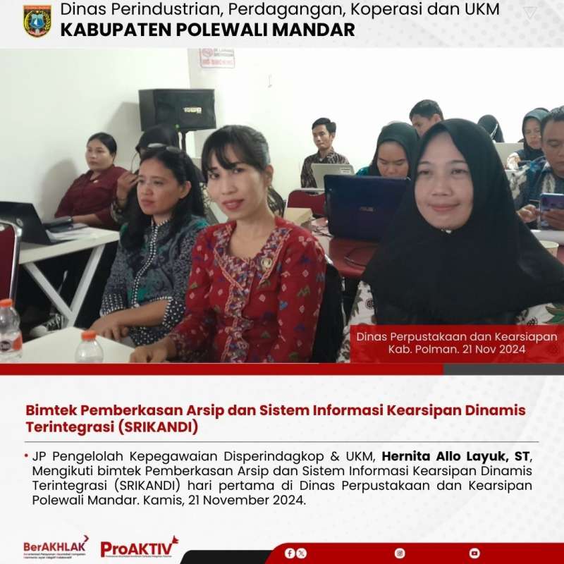 JP Pengelolah Kepegawaian Disperindagkop & UKM, Hernita Allo Layuk, ST, Mengikuti bimtek Pemberkasan Arsip dan Sistem Informasi Kearsipan Dinamis Terintegrasi (SRIKANDI) hari pertama di Dinas Perpustakaan dan Kearsipan Polewali Mandar. Kamis, 21 November 2024.