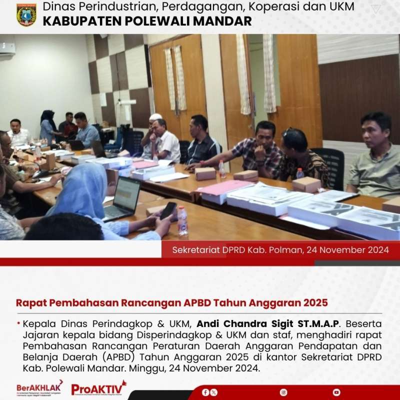 Kepala Dinas Perindagkop & UKM, Andi Chandra Sigit ST.M.A.P. Beserta Jajaran kepala bidang Disperindagkop & UKM dan staf, menghadiri rapat Pembahasan Rancangan Peraturan Daerah Anggaran Pendapatan dan Belanja Daerah (APBD) Tahun Anggaran 2025 di kantor Sekretariat DPRD Kab. Polewali Mandar. Minggu, 24 November 2024.
