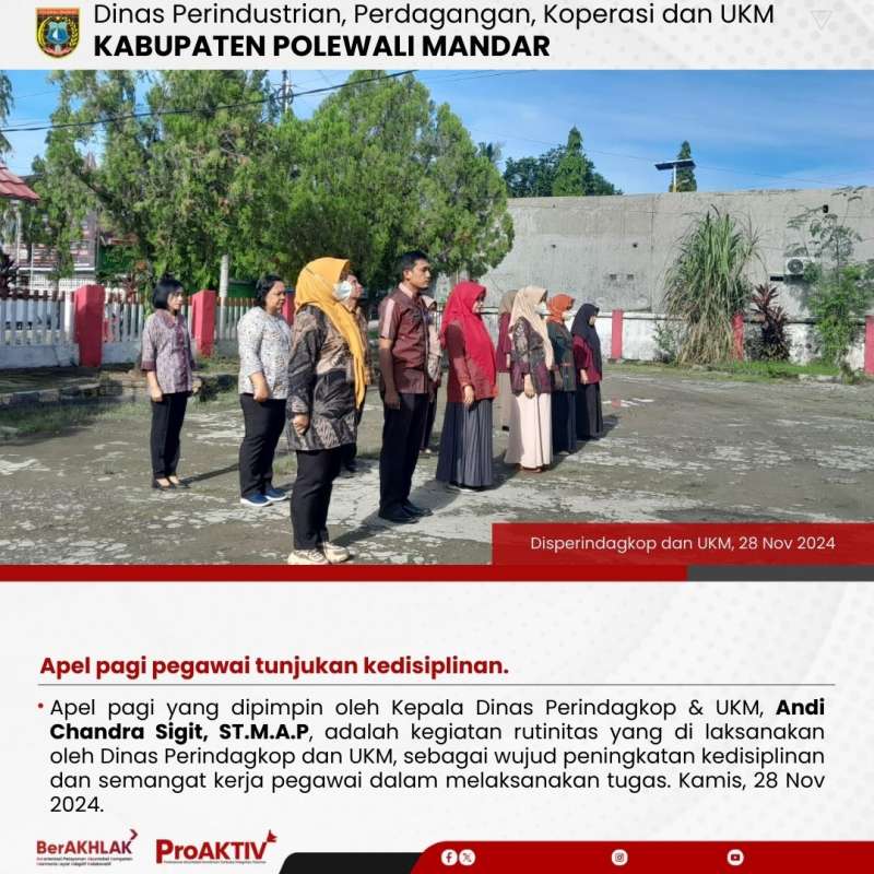 Apel pagi yang dipimpin oleh Kepala Dinas Perindagkop & UKM, Andi Chandra Sigit, ST.M.A.P, adalah kegiatan rutinitas yang di laksanakan oleh Dinas Perindagkop dan UKM, sebagai wujud peningkatan kedisiplinan dan semangat kerja pegawai dalam melaksanakan tugas. Kamis, 28 Nov 2024.