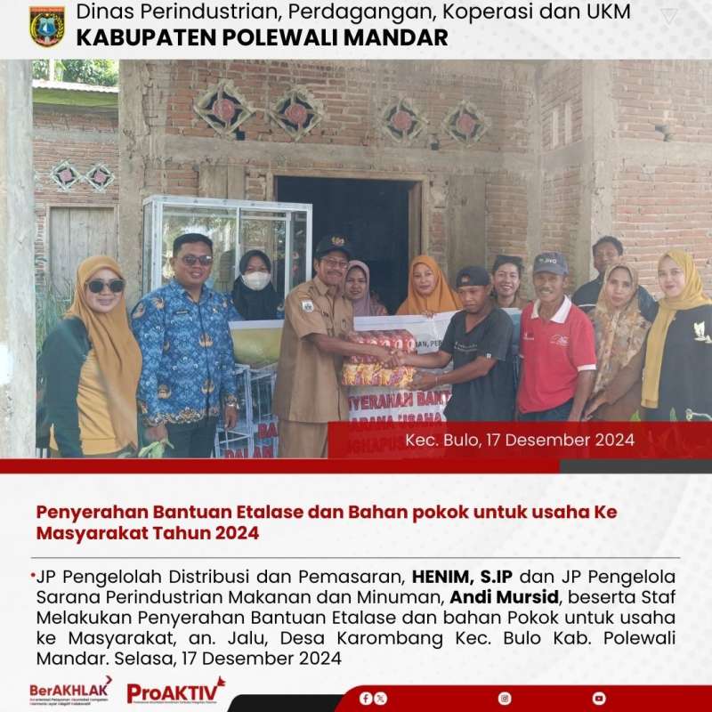 JP Pengelolah Distribusi dan Pemasaran, HENIM, S.IP dan JP Pengelola Sarana Perindustrian Makanan dan Minuman, Andi Mursid, beserta Staf Melakukan Penyerahan Bantuan Etalase dan bahan Pokok untuk usaha ke Masyarakat, an. Jalu, Desa Karombang Kec. Bulo Kab. Polewali Mandar. Selasa, 17 Desember 2024