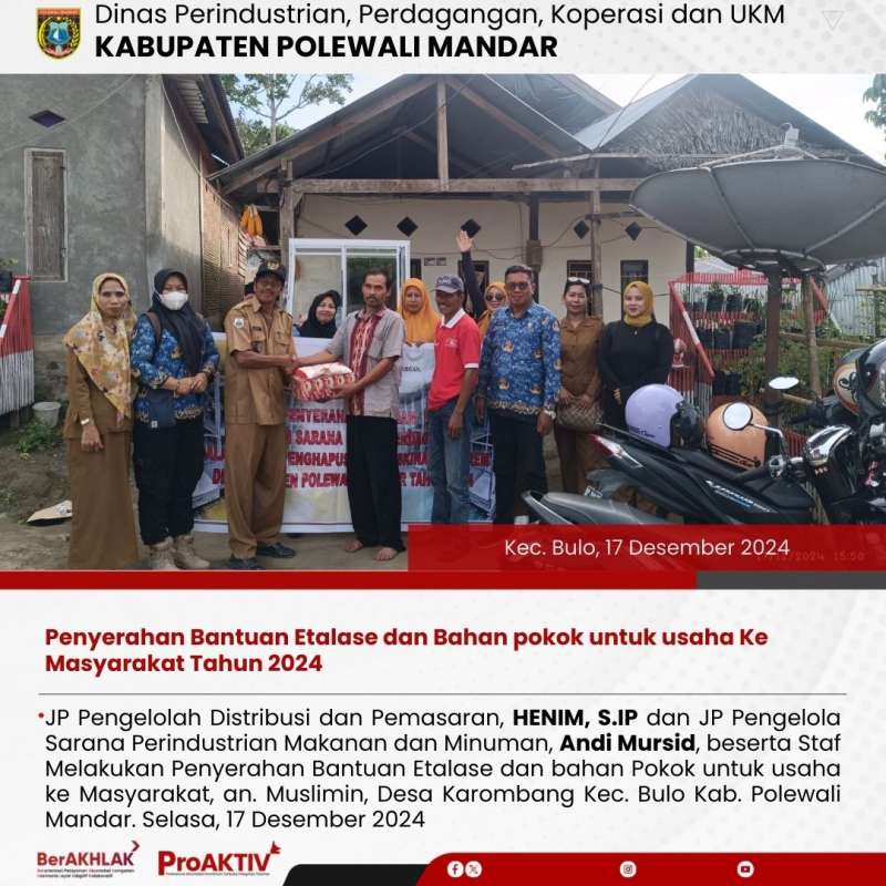 JP Pengelolah Distribusi dan Pemasaran, HENIM, S.IP dan JP Pengelola Sarana Perindustrian Makanan dan Minuman, Andi Mursid, beserta Staf Melakukan Penyerahan Bantuan Etalase dan bahan Pokok untuk usaha ke Masyarakat, an. Muslimin, Desa Karombang Kec. Bulo Kab. Polewali Mandar. Selasa, 17 Desember 2024
