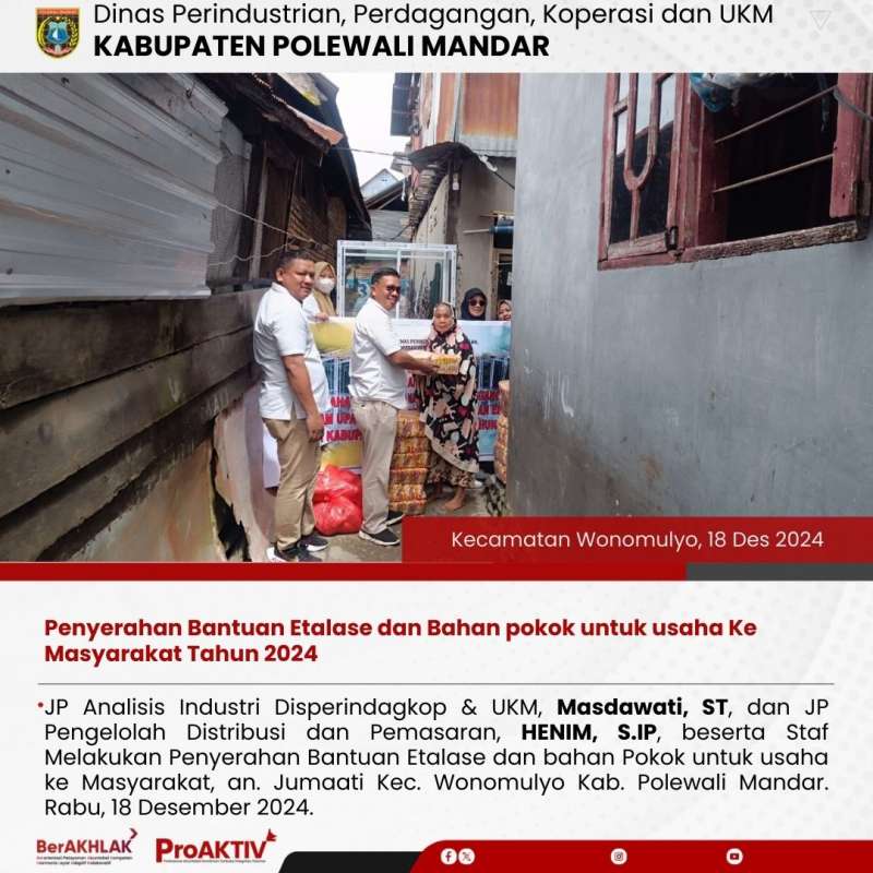 JP Analisis Industri Disperindagkop & UKM, Masdawati, ST, dan JP Pengelolah Distribusi dan Pemasaran, HENIM, S.IP, beserta Staf Melakukan Penyerahan Bantuan Etalase dan bahan Pokok untuk usaha ke Masyarakat, an. Jumaati Kec. Wonomulyo Kab. Polewali Mandar. Rabu, 18 Desember 2024.