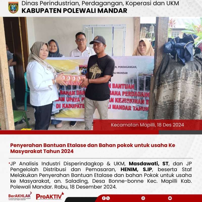 JP Analisis Industri Disperindagkop & UKM, Masdawati, ST, dan JP Pengelolah Distribusi dan Pemasaran, HENIM, S.IP, beserta Staf Melakukan Penyerahan Bantuan Etalase dan bahan Pokok untuk usaha ke Masyarakat, an. Salading, Desa Bonne-bonne Kec. Mapilli Kab. Polewali Mandar. Rabu, 18 Desember 2024.