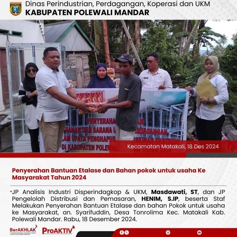 JP Analisis Industri Disperindagkop & UKM, Masdawati, ST, dan JP Pengelolah Distribusi dan Pemasaran, HENIM, S.IP, beserta Staf Melakukan Penyerahan Bantuan Etalase dan bahan Pokok untuk usaha ke Masyarakat, an. Syarifuddin, Desa Tonrolima Kec. Matakali Kab. Polewali Mandar. Rabu, 18 Desember 2024.
