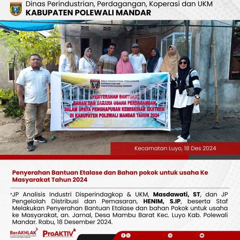 JP Analisis Industri Disperindagkop & UKM, Masdawati, ST, dan JP Pengelolah Distribusi dan Pemasaran, HENIM, S.IP, beserta Staf Melakukan Penyerahan Bantuan Etalase dan bahan Pokok untuk usaha ke Masyarakat, an. Jamal, Desa Mambu Barat Kec. Luyo Kab. Polewali Mandar. Rabu, 18 Desember 2024.
