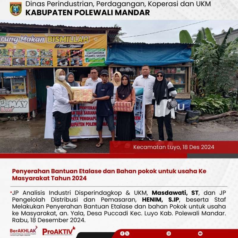 JP Analisis Industri Disperindagkop & UKM, Masdawati, ST, dan JP Pengelolah Distribusi dan Pemasaran, HENIM, S.IP, beserta Staf Melakukan Penyerahan Bantuan Etalase dan bahan Pokok untuk usaha ke Masyarakat, an. Yala, Desa Puccadi Kec. Luyo Kab. Polewali Mandar. Rabu, 18 Desember 2024.