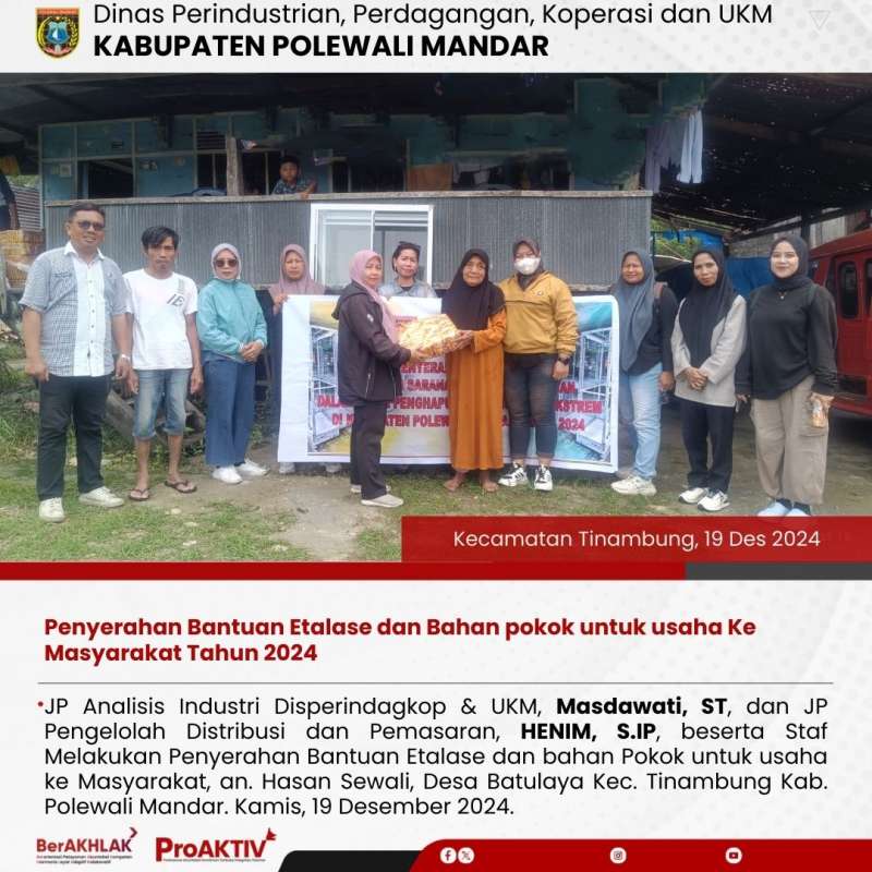 JP Analisis Industri Disperindagkop & UKM, Masdawati, ST, dan JP Pengelolah Distribusi dan Pemasaran, HENIM, S.IP, beserta Staf Melakukan Penyerahan Bantuan Etalase dan bahan Pokok untuk usaha ke Masyarakat, an. Hasan Sewali, Desa Batulaya Kec. Tinambung Kab. Polewali Mandar. Kamis, 19 Desember 2024.