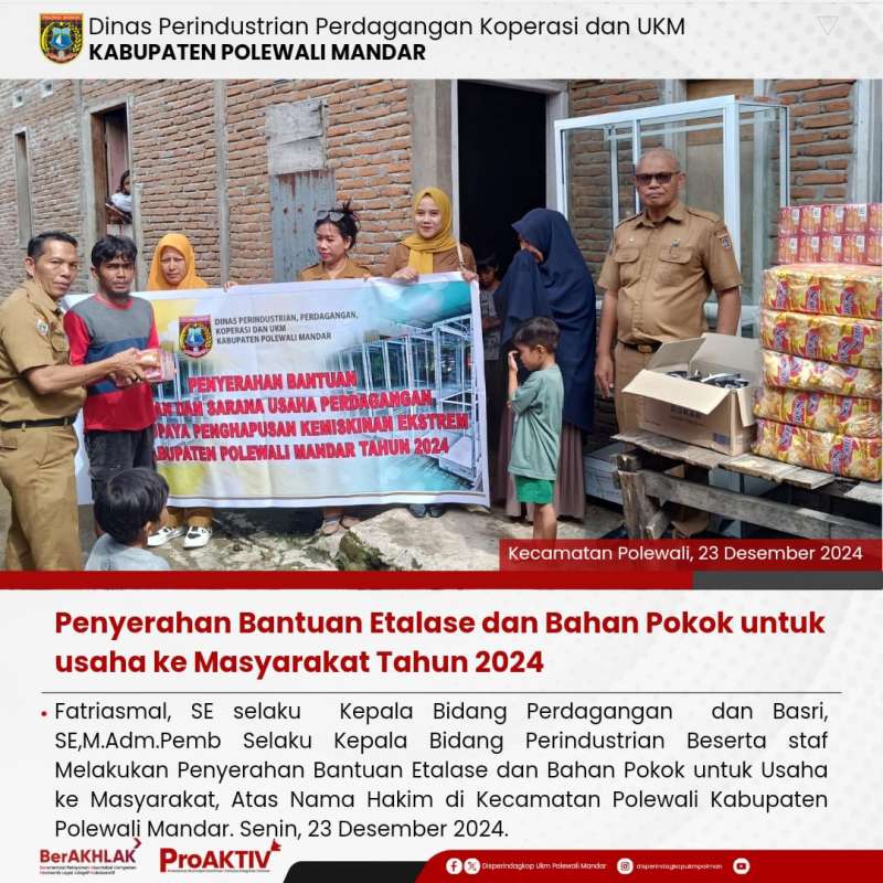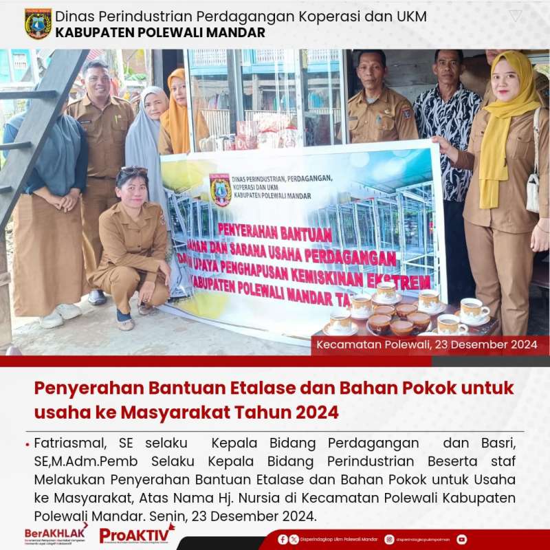 Fatriasmal, SE, selaku Kepala Bidang Perdagangan bersama Basri, SE., M.Adm.Pemb, selaku Kepala Bidang Perindustrian melakukan penyerahan bantuan etalase dan bahan pokok untuk usaha bagi masyarakat, an. Rohaeni, Hj. Nursia dan Hakim di Kecamatan Polewali, Kabupaten Polewali Mandar pada hari senin, 23 Desember 2024