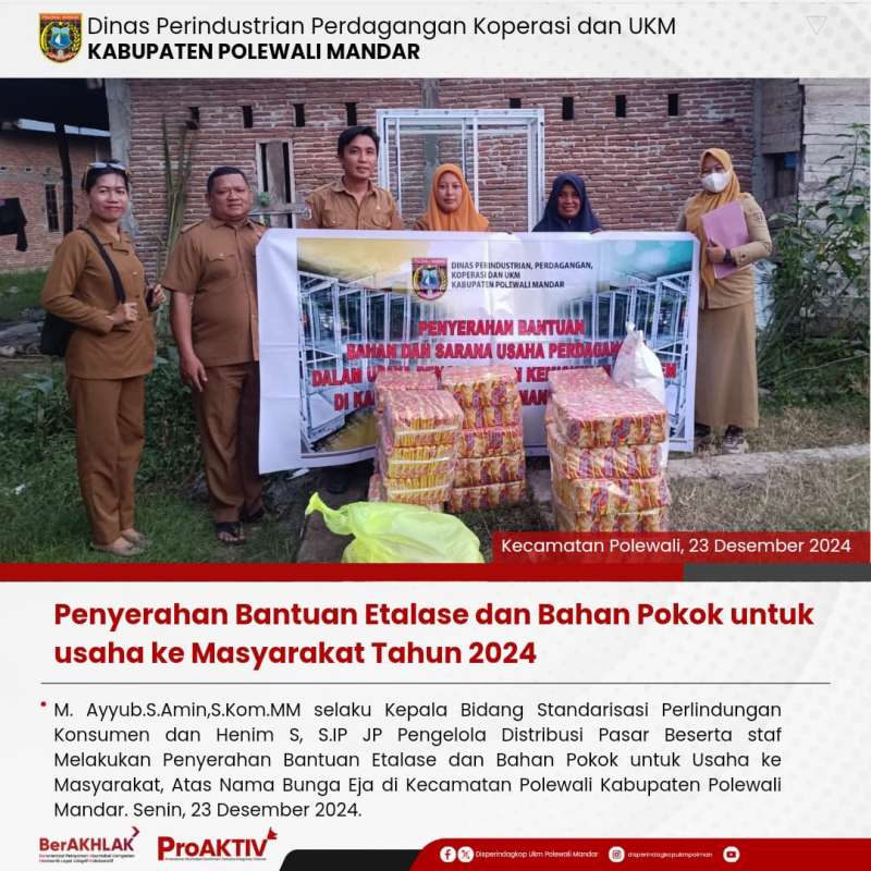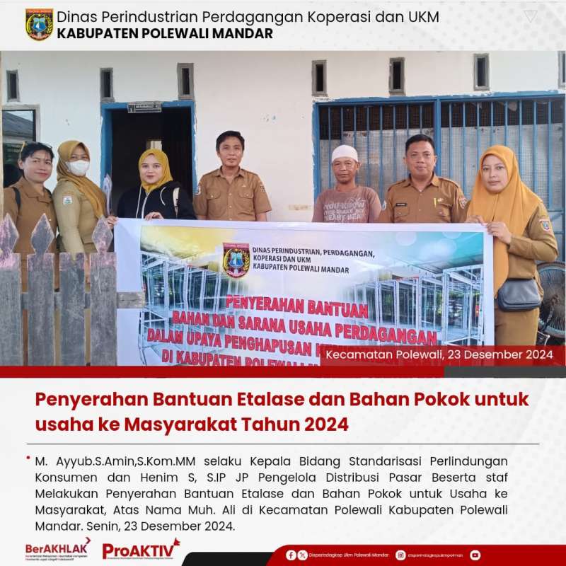 M.Ayyub.S.Amin, S.Kom., MM, selaku Kepala Bidang Standarisasi Perlindungan Konsumen bersama JP Pengelola Distribusi Pasar, Henim. S, S.IP beserta staf Dinas Perindagkop dan UKM melakukan penyerahan bantuan etalase dan bahan pokok untuk usaha bagi masyarakat, an. Mahyuddin, Muh. Ali dan Bunga Eja di Kecamatan Polewali, Kabupaten Polewali Mandar pada hari senin, 23 Desember 2024