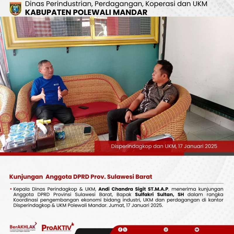Kepala Dinas Perindagkop & UKM, Andi Chandra Sigit ST.M.A.P. menerima kunjungan Anggota DPRD Provinsi Sulawesi Barat, Bapak Sulfakri Sultan, SH dalam rangka Koordinasi pengembangan ekonomi bidang industri, UKM dan perdagangan di kantor Disperindagkop & UKM Polewali Mandar. Jumat, 17 Januari 2025.