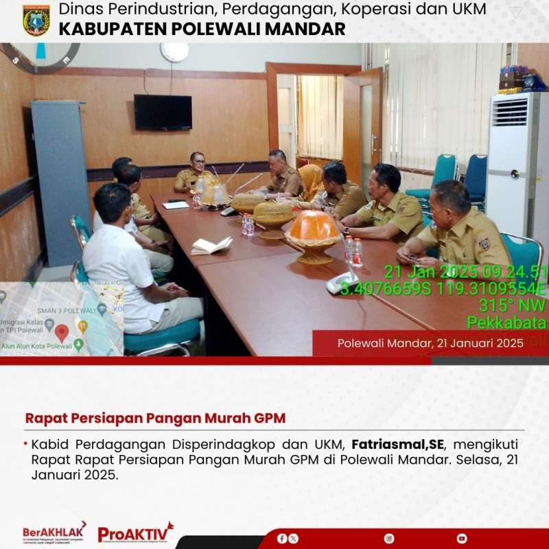 Kabid Perdagangan Disperindagkop dan UKM, Fatriasmal,SE, mengikuti Rapat Rapat Persiapan Pangan Murah GPM di Polewali Mandar. Selasa, 21 Januari 2025.