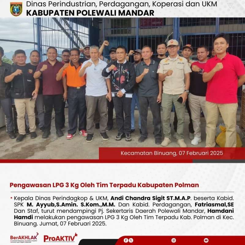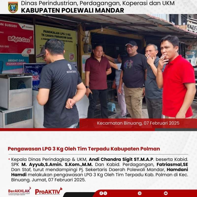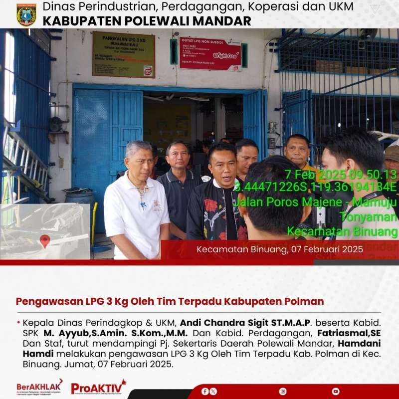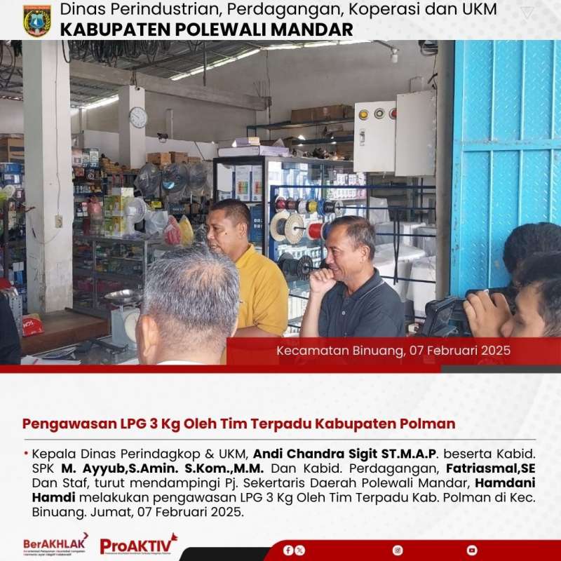 Kepala Dinas Perindagkop & UKM, Andi Chandra Sigit ST.M.A.P. beserta Kabid. SPK M. Ayyub,S.Amin. S.Kom.,M.M. Dan Kabid. Perdagangan, Fatriasmal,SE Dan Staf, turut mendampingi Pj. Sekertaris Daerah Polewali Mandar, Hamdani Hamdi melakukan pengawasan LPG 3 Kg Oleh Tim Terpadu Kab. Polman di Kec. Binuang. Jumat, 07 Februari 2025.