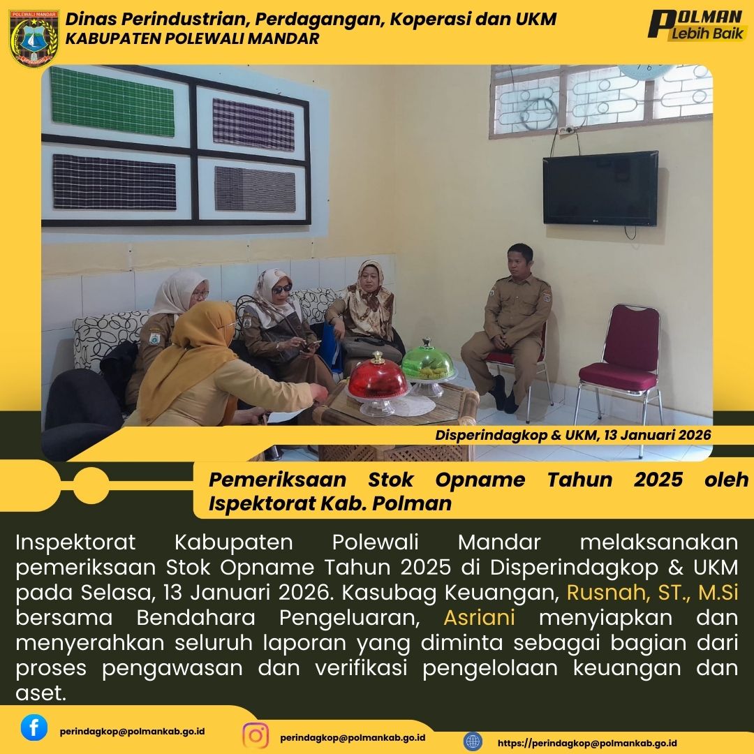 Inspektorat Kabupaten Polewali Mandar melaksanakan pemeriksaan Stok Opname Tahun 2025 di Disperindagkop & UKM pada Selasa, 13 Januari 2026. Kasubag Keuangan, Rusnah, ST., M.Si bersama Bendahara Pengeluaran, Asriani menyiapkan dan menyerahkan seluruh laporan yang diminta sebagai bagian dari proses pengawasan dan verifikasi pengelolaan keuangan dan aset....