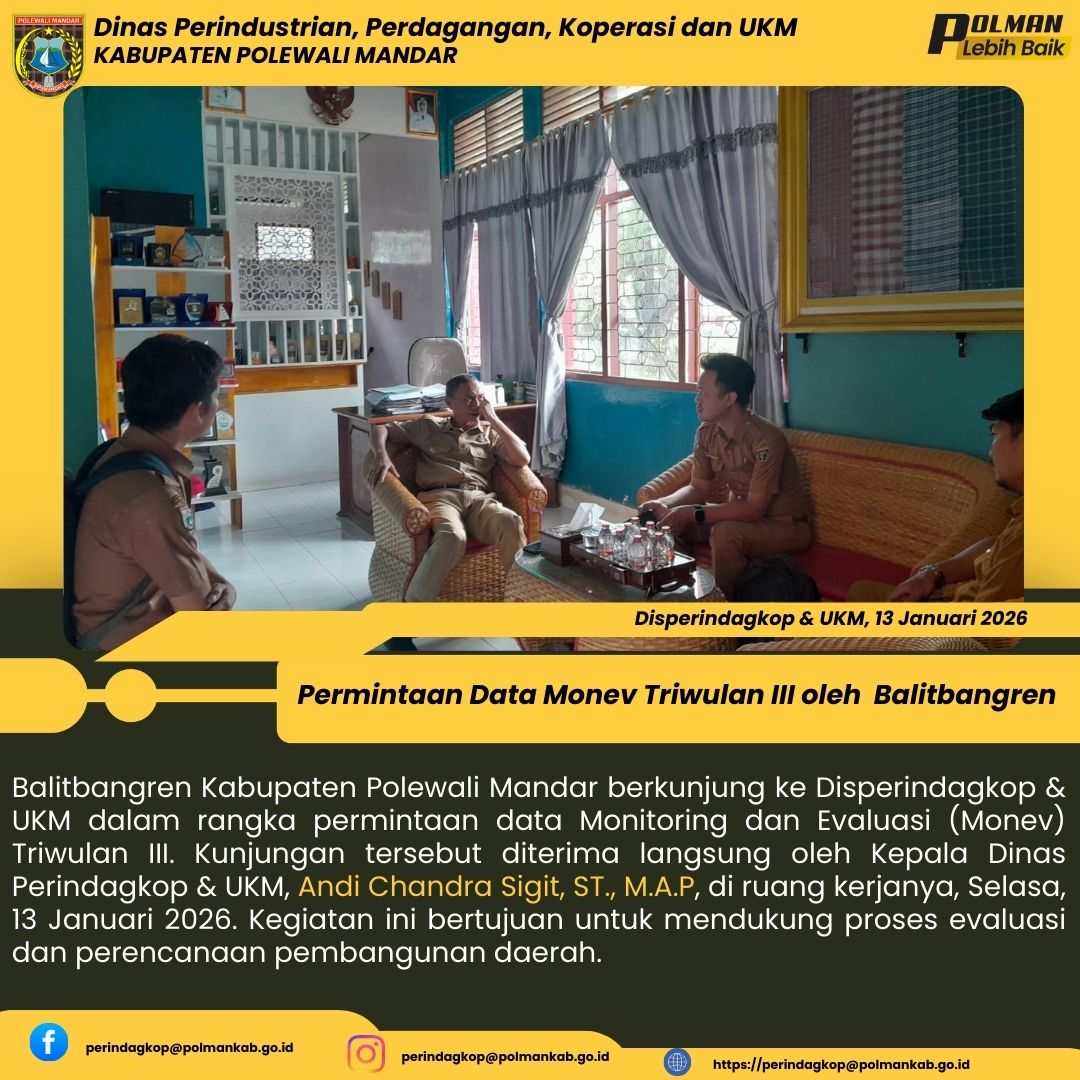 Balitbangren Kabupaten Polewali Mandar berkunjung ke Disperindagkop & UKM dalam rangka permintaan data Monitoring dan Evaluasi (Monev) Triwulan III. Kunjungan tersebut diterima langsung oleh Kepala Dinas Perindagkop & UKM, Andi Chandra Sigit, ST., M.A.P, di ruang kerjanya, Selasa, 13 Januari 2026. Kegiatan ini bertujuan untuk mendukung proses evaluasi dan perencanaan pembangunan daerah....