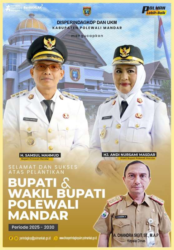 Kepala Dinas Perindutrisn Perdagangan Koperasi dan UKM Kab. Polman mengucapkan Selamat dan Sukses Atas Pelantikan Bupati Terpilih Kabupaten Polewali Mandar Periode 2025 - 2029