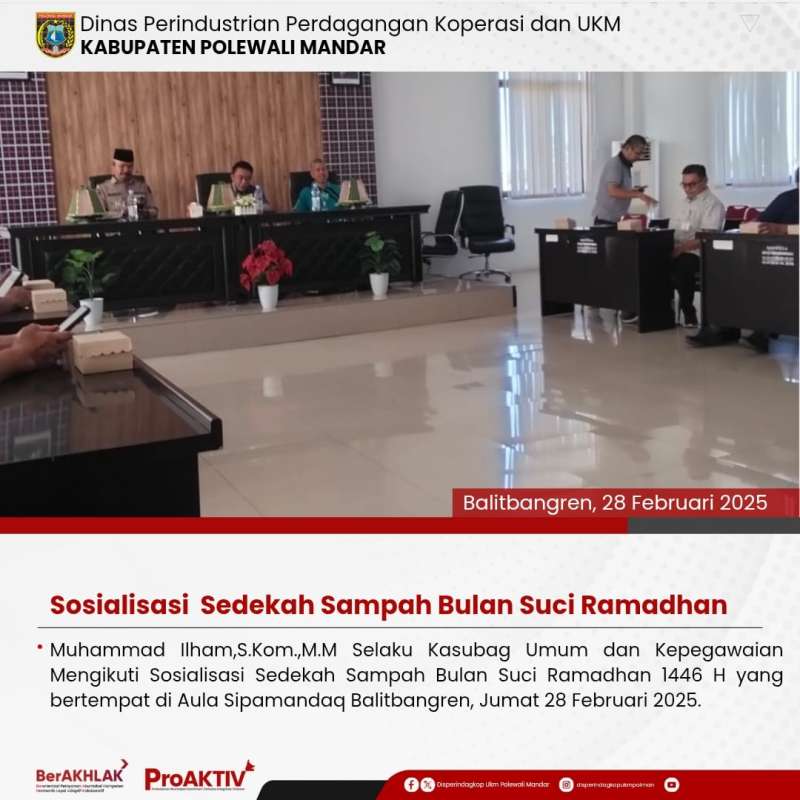 Sosialisasi sedekah sampah di Bulan Suci Ramadhan yang dihadiri oleh Kasubag. Umum dan Kepegawaian, MUHAMMAD ILHAM, S.Kom., M.M di Aula Sipamandaq Balitbangren pada hari jumat, 28 Februari 2025