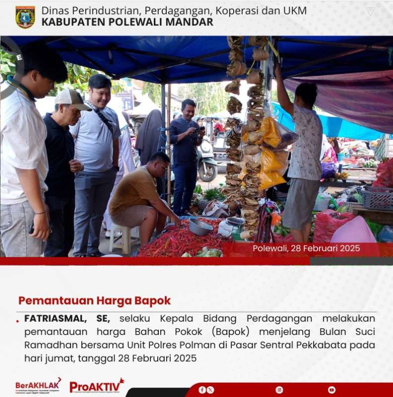FATRIASMANL, SE, selaku Kepala Bidang Perdagangan, melakukan pemantauan harga Bahan Pokok (Bapok) menjelang Bulan Suci Ramadhan bersama unit Polres Polman di Pasar Sentral Pekkabata pada hari jumat, 28 Februari 2025