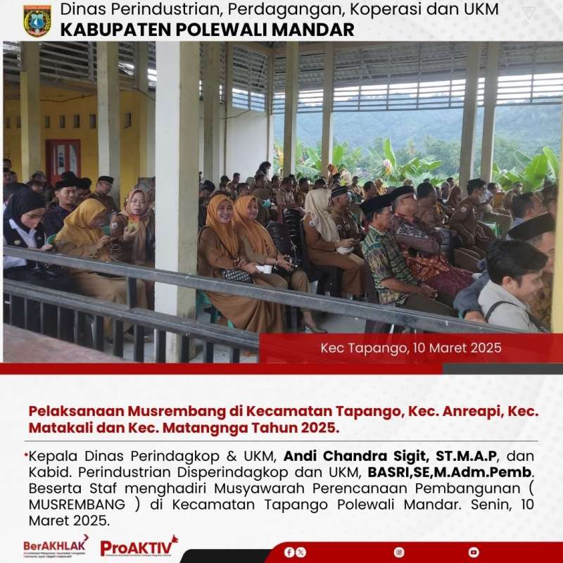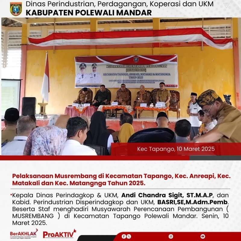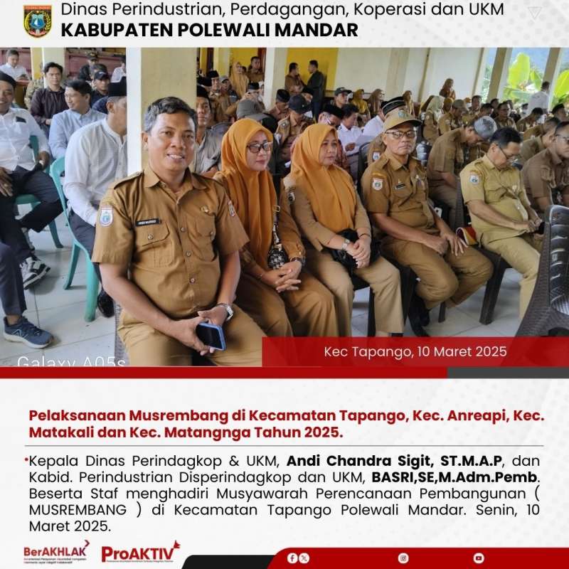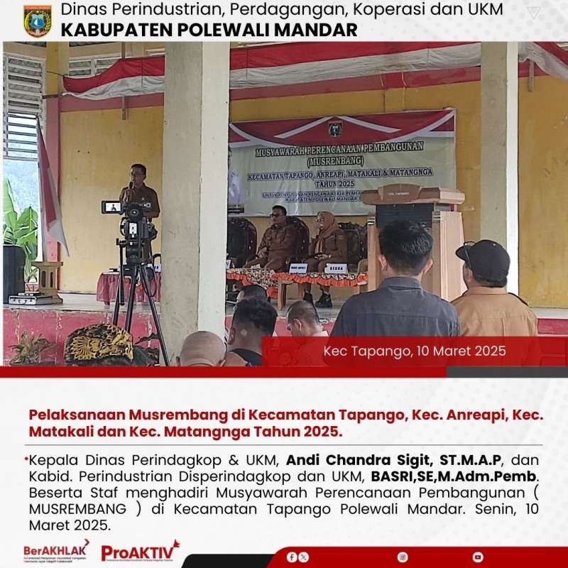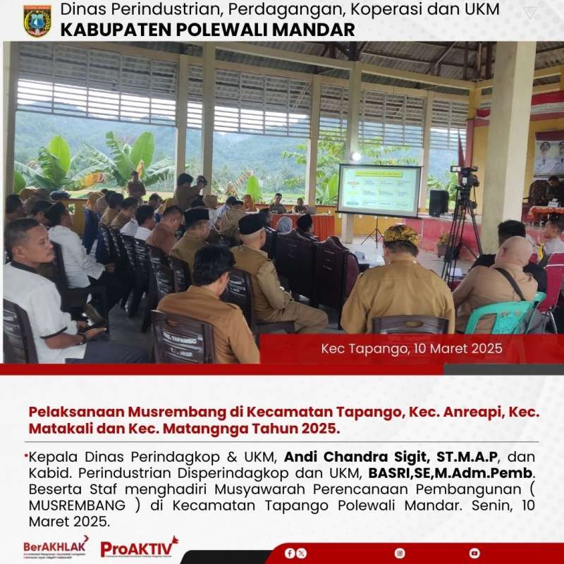 Kepala Dinas Perindagkop & UKM, Andi Chandra Sigit, ST.M.A.P, dan Kabid. Perindustrian Disperindagkop dan UKM, BASRI,SE,M.Adm.Pemb. Beserta Staf menghadiri Musyawarah Perencanaan Pembangunan ( MUSREMBANG ) di Kecamatan Tapango Polewali Mandar. Senin, 10 Maret 2025.