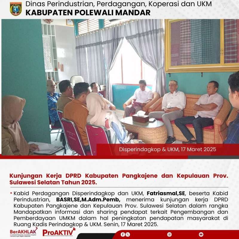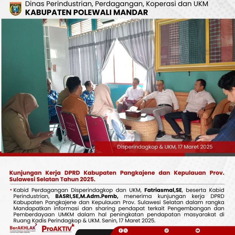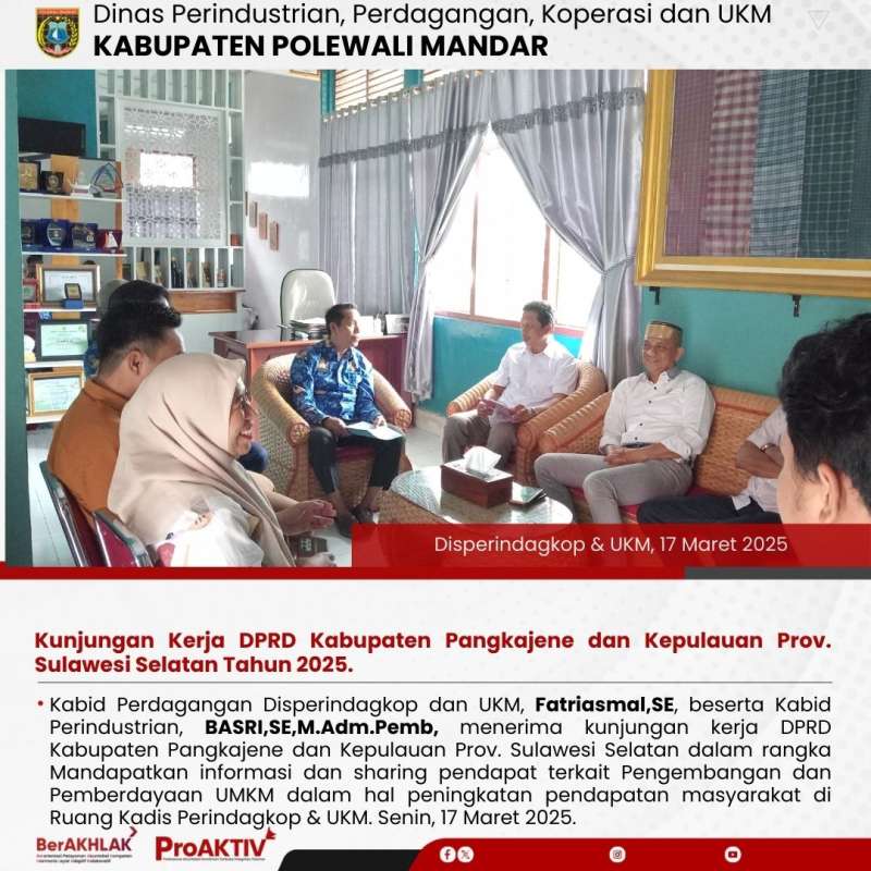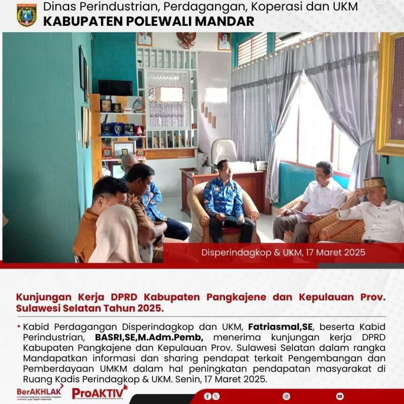 Kabid Perdagangan Disperindagkop dan UKM, Fatriasmal,SE, beserta Kabid Perindustrian, BASRI,SE,M.Adm.Pemb, menerima kunjungan kerja DPRD Kabupaten Pangkajene dan Kepulauan Prov. Sulawesi Selatan dalam rangka Mandapatkan informasi dan sharing pendapat terkait Pengembangan dan Pemberdayaan UMKM dalam hal peningkatan pendapatan masyarakat di Ruang Kadis Perindagkop & UKM. Senin, 17 Maret 2025.