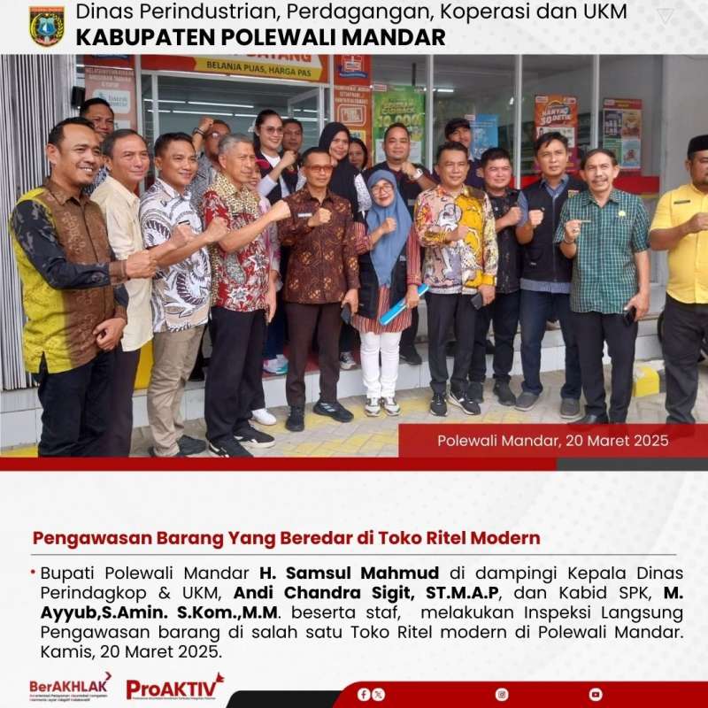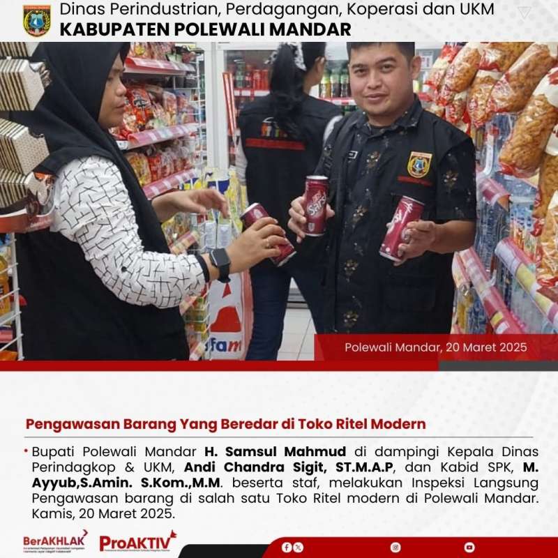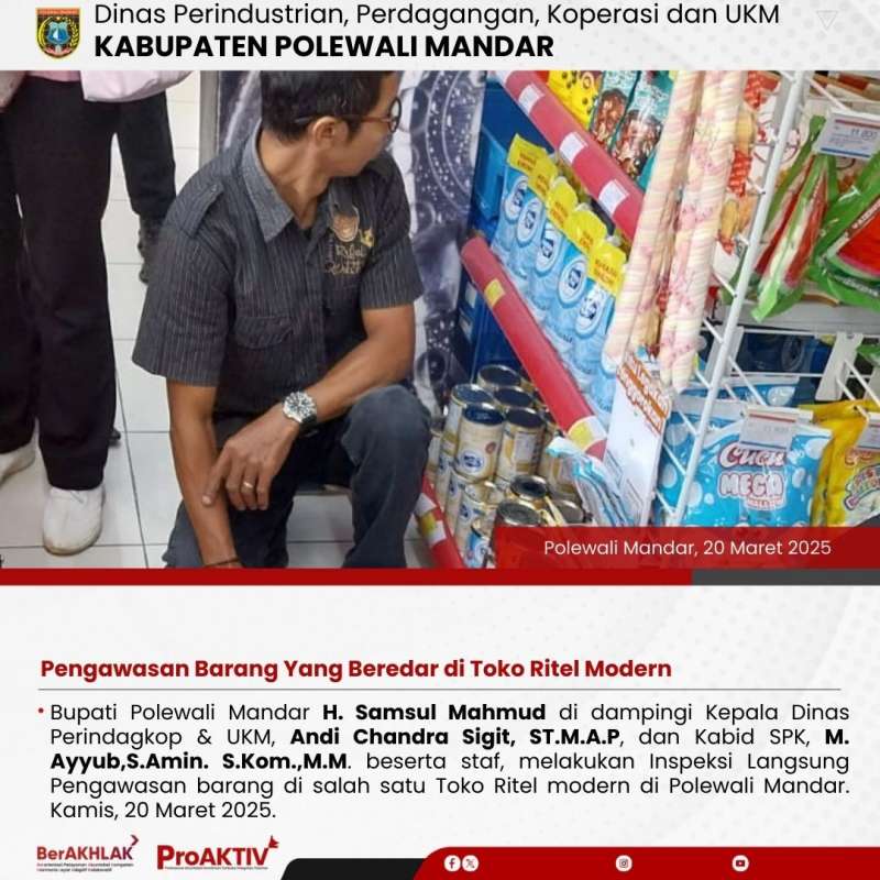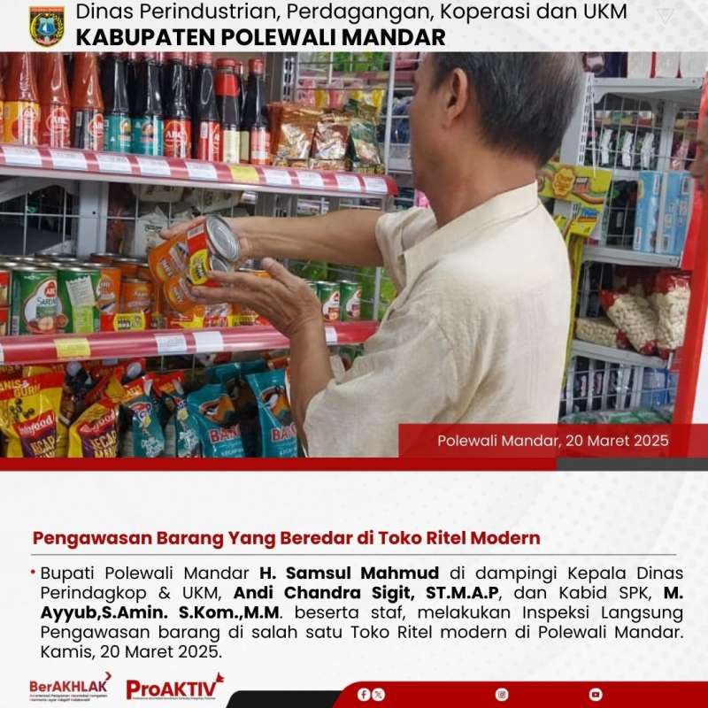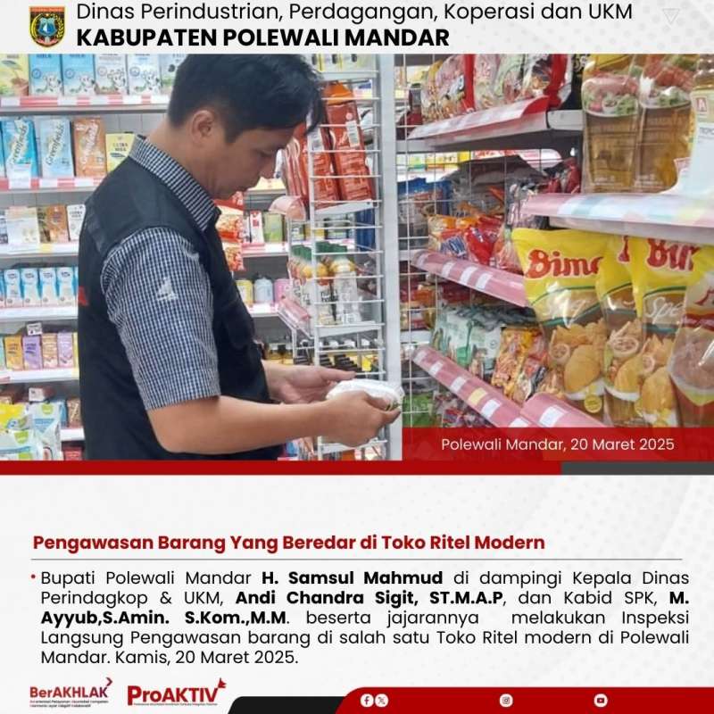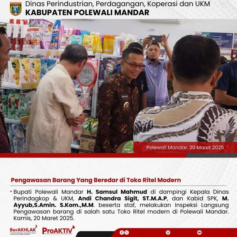 Bupati Polewali Mandar H. Samsul Mahmud di dampingi Kepala Dinas Perindagkop & UKM, Andi Chandra Sigit, ST.M.A.P, dan Kabid SPK, M. Ayyub,S.Amin. S.Kom.,M.M. beserta staf, melakukan Inspeksi Langsung Pengawasan barang di salah satu Toko Ritel modern di Polewali Mandar. Kamis, 20 Maret 2025.