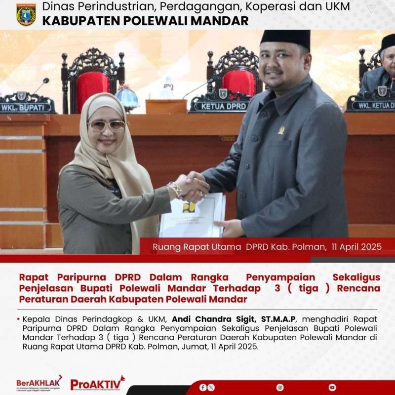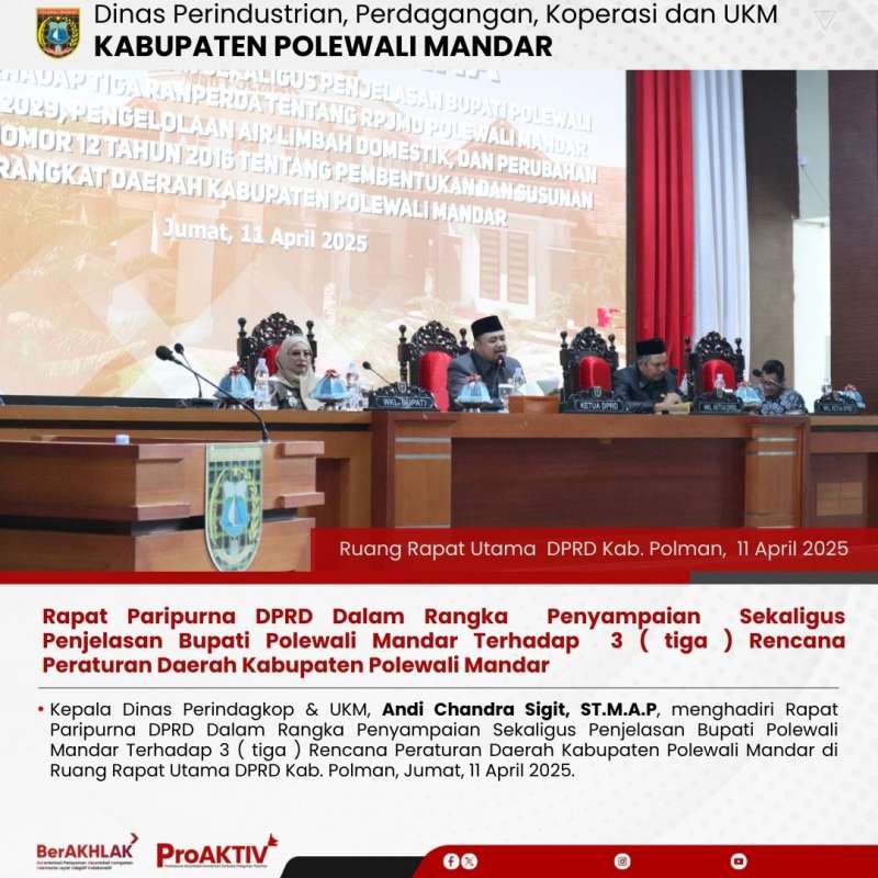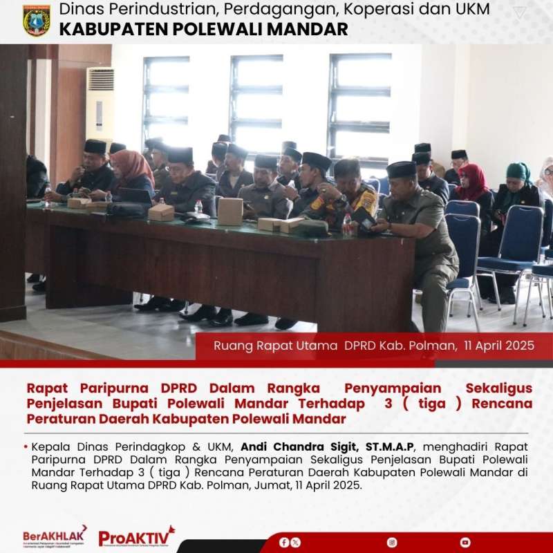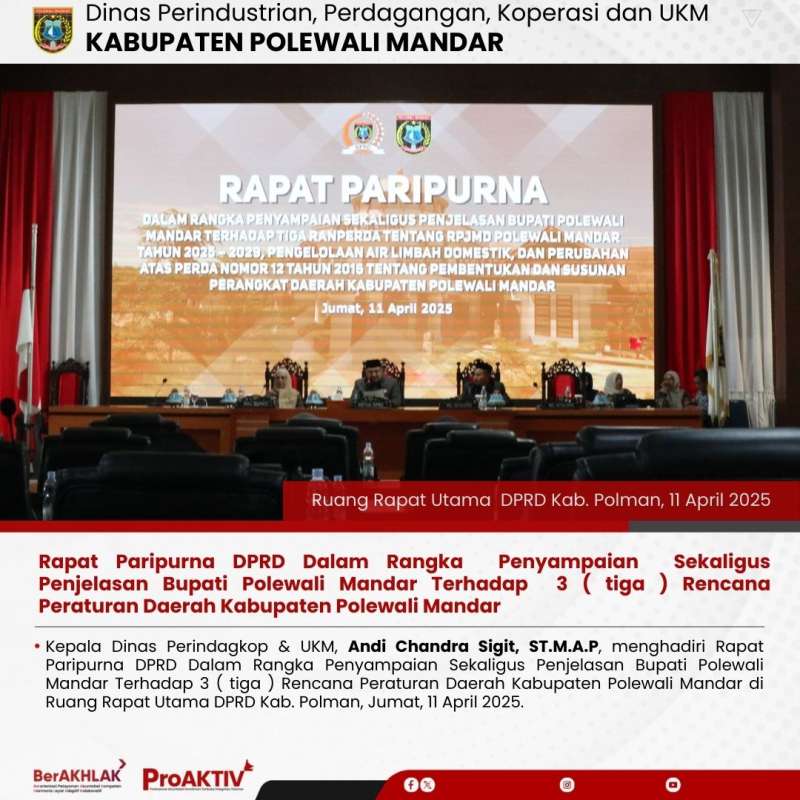 Kepala Dinas Perindagkop & UKM, Andi Chandra Sigit, ST.M.A.P, menghadiri Rapat Paripurna DPRD Dalam Rangka Penyampaian Sekaligus Penjelasan Bupati Polewali Mandar Terhadap 3 ( tiga ) Rencana Peraturan Daerah Kabupaten Polewali Mandar di Ruang Rapat Utama DPRD Kab. Polman, Jumat, 11 April 2025.