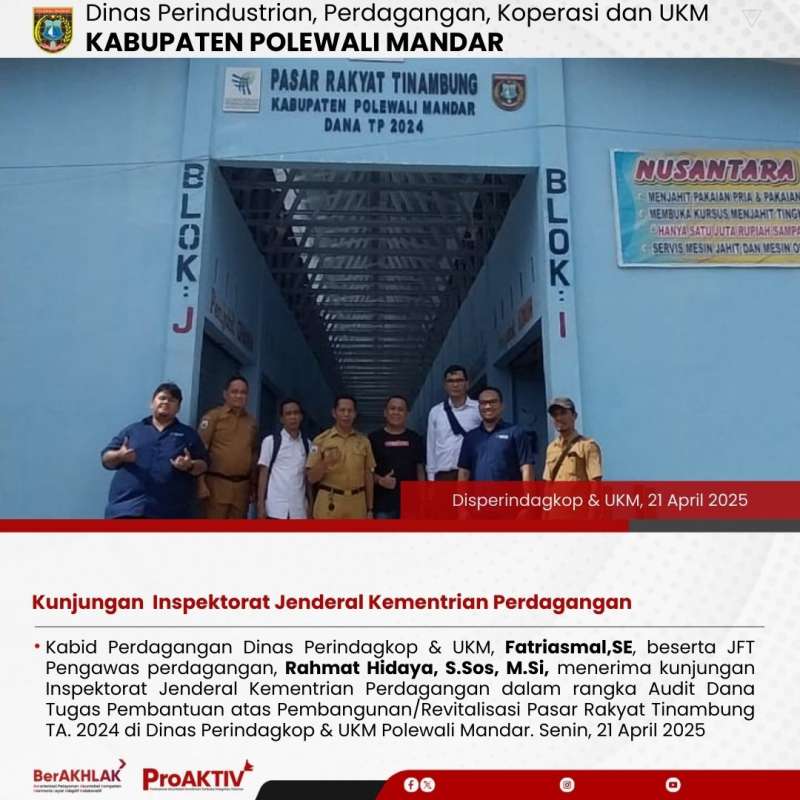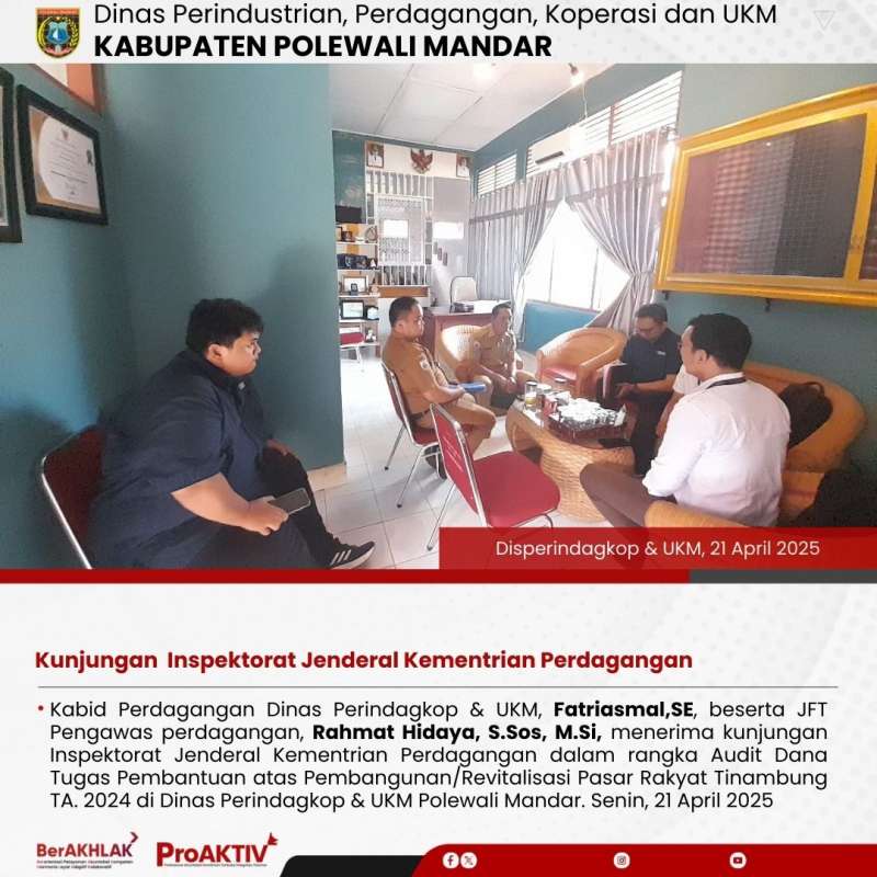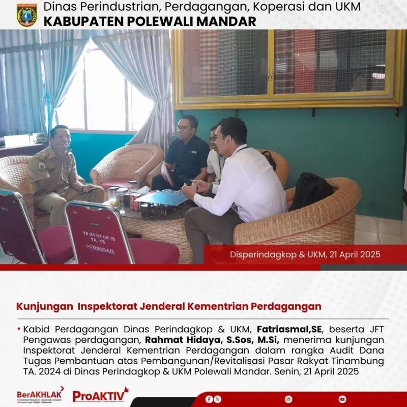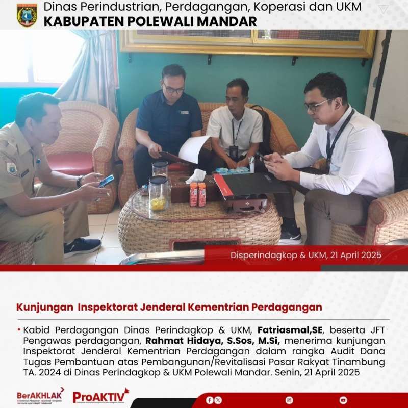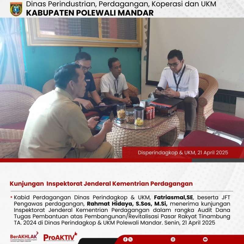 Kabid Perdagangan Dinas Perindagkop & UKM, Fatriasmal,SE, beserta JFT Pengawas perdagangan, Rahmat Hidaya, S.Sos, M.Si, menerima kunjungan Inspektorat Jenderal Kementrian Perdagangan dalam rangka Audit Dana Tugas Pembantuan atas Pembangunan/Revitalisasi Pasar Rakyat Tinambung TA. 2024 di Dinas Perindagkop & UKM Polewali Mandar. Senin, 21 April 2025