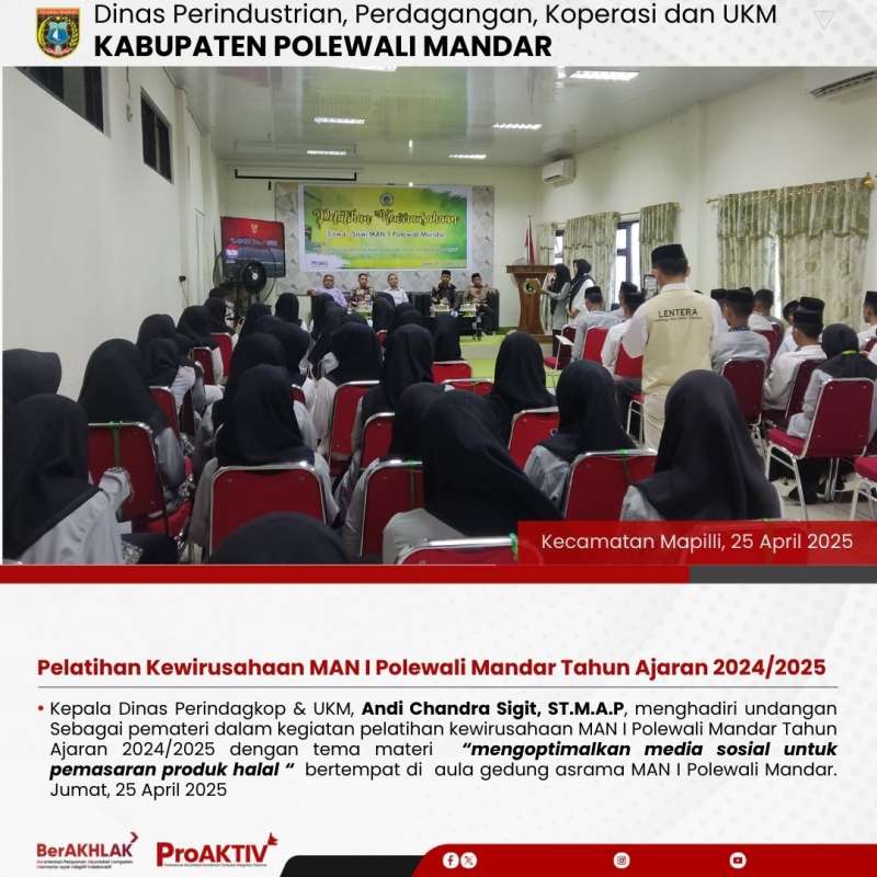 Kepala Dinas Perindagkop & UKM, Andi Chandra Sigit, ST.M.A.P, menghadiri undangan Sebagai pemateri dalam kegiatan pelatihan kewirusahaan MAN I Polewali Mandar Tahun Ajaran 2024/2025 dengan tema materi “mengoptimalkan media sosial untuk pemasaran produk halal “ bertempat di aula gedung asrama MAN I Polewali Mandar. Jumat, 25 April 2025
