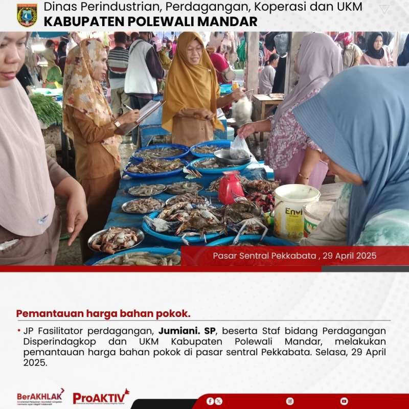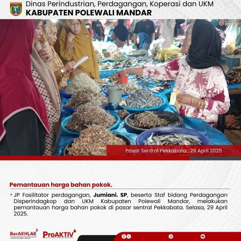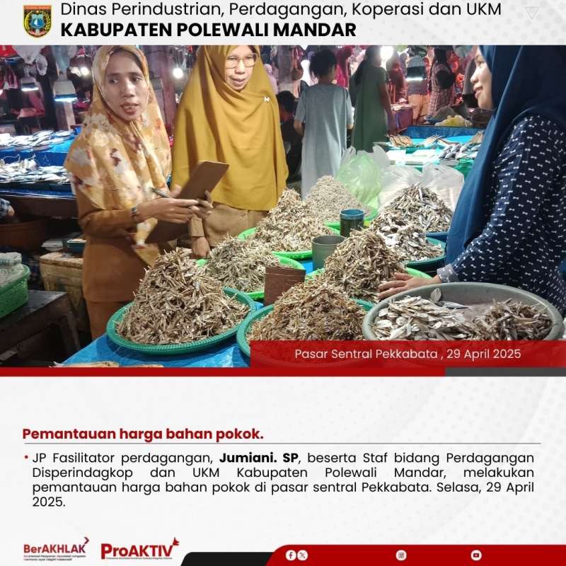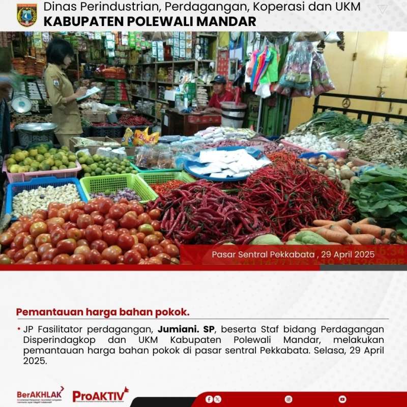 JP Fasilitator perdagangan, Jumiani. SP, beserta Staf bidang Perdagangan Disperindagkop dan UKM Kabupaten Polewali Mandar, melakukan pemantauan harga bahan pokok di pasar sentral Pekkabata. Selasa, 29 April 2025.