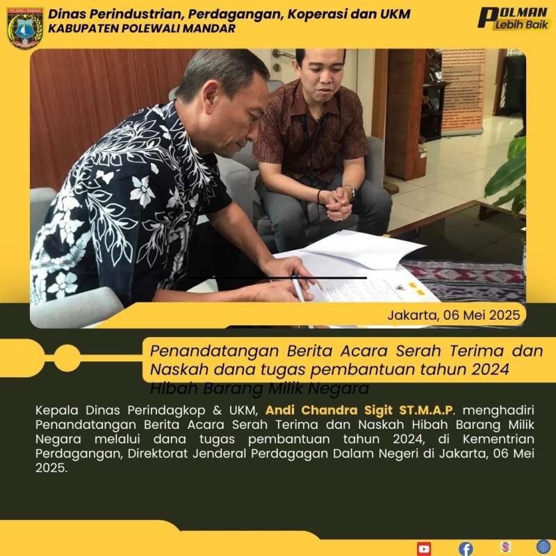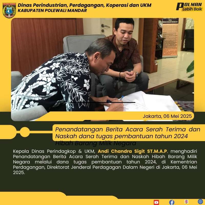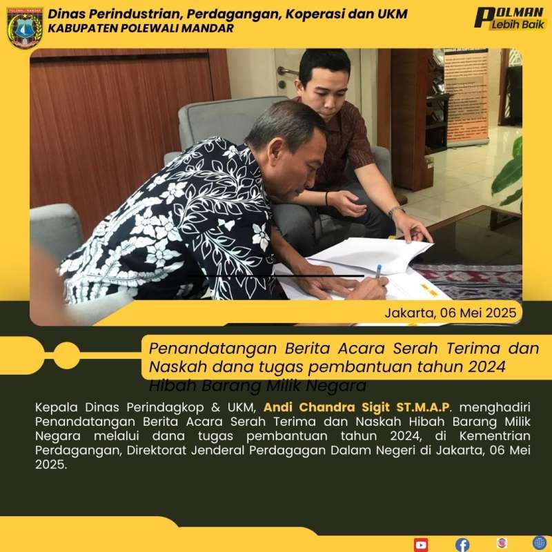 Kepala Dinas Perindagkop & UKM, Andi Chandra Sigit ST.M.A.P. menghadiri Penandatangan Berita Acara Serah Terima dan Naskah Hibah Barang Milik Negara melalui dana tugas pembantuan tahun 2024, di Kementrian Perdagangan, Direktorat Jenderal Perdagagan Dalam Negeri di Jakarta, 06 Mei 2025.