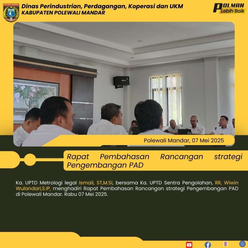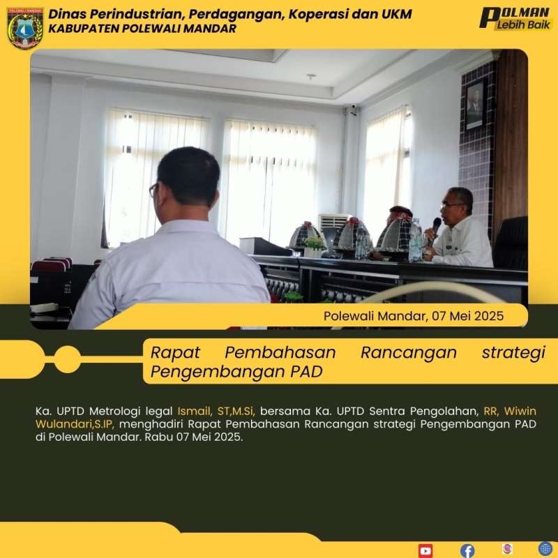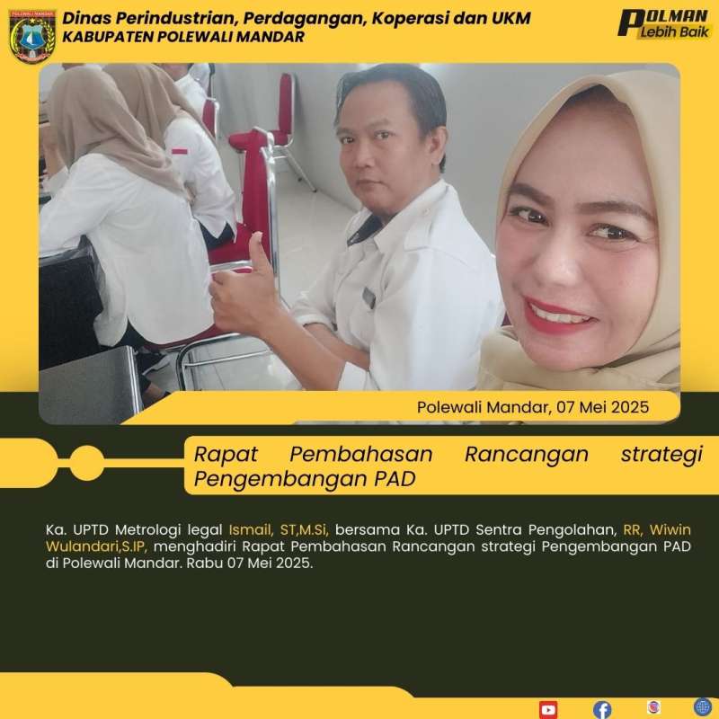Ka. UPTD Metrologi legal Ismail, ST,M.Si, bersama Ka. UPTD Sentra Pengolahan, RR, Wiwin Wulandari,S.IP, menghadiri Rapat Pembahasan Rancangan strategi Pengembangan PAD di Polewali Mandar. Rabu 07 Mei 2025.