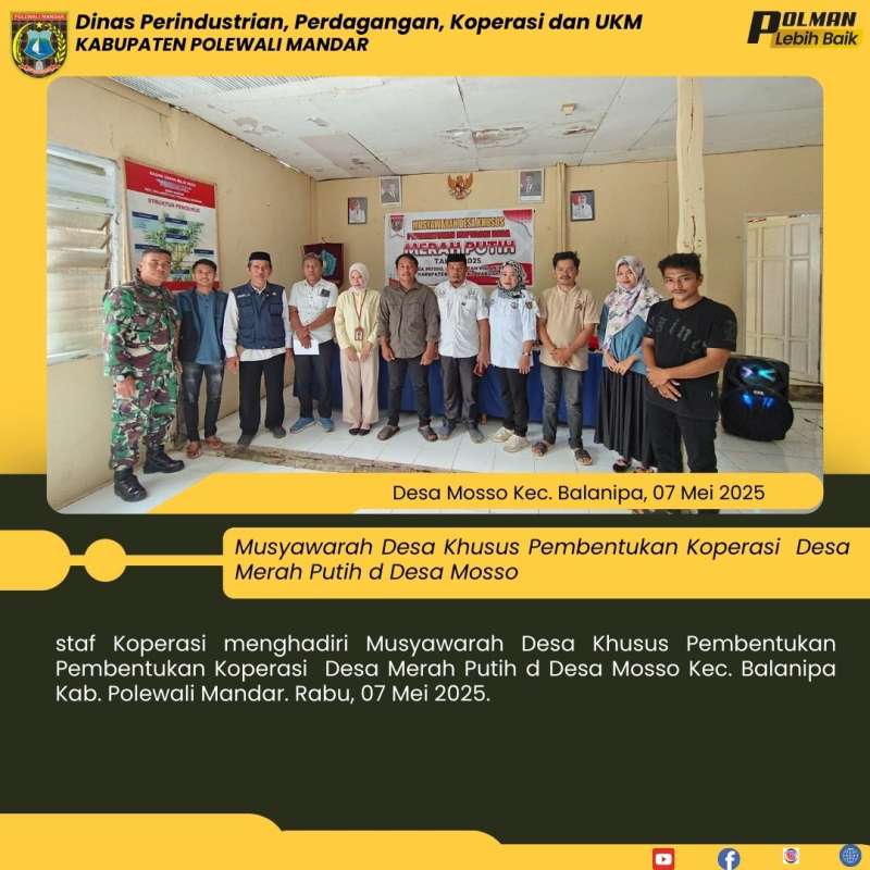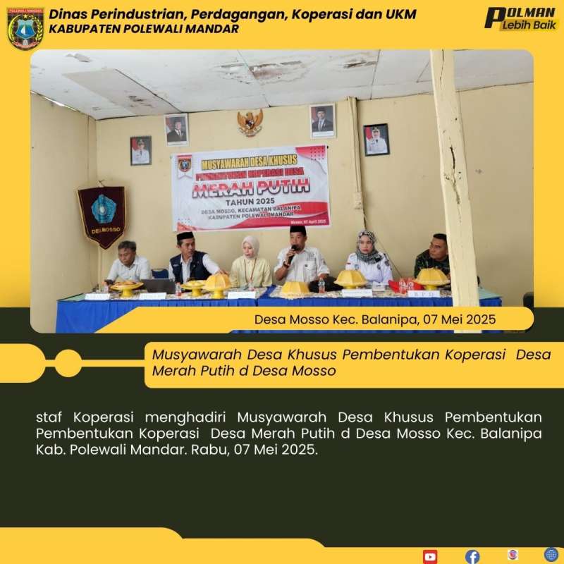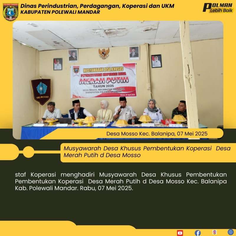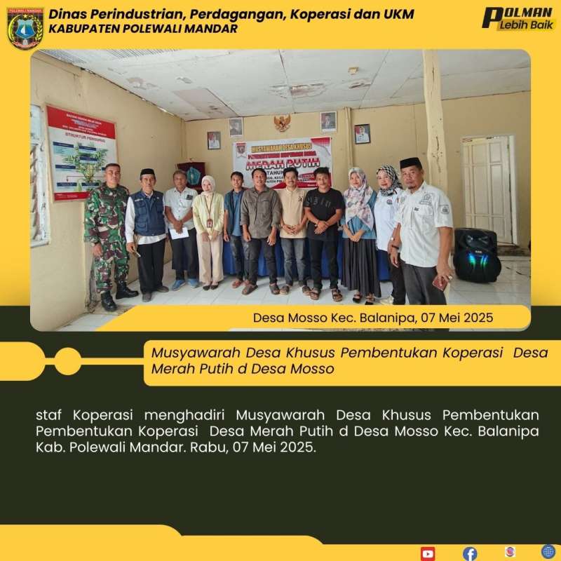 staf Koperasi menghadiri Musyawarah Desa Khusus Pembentukan Pembentukan Koperasi Desa Merah Putih d Desa Mosso Kec. Balanipa Kab. Polewali Mandar. Rabu, 07 Mei 2025.