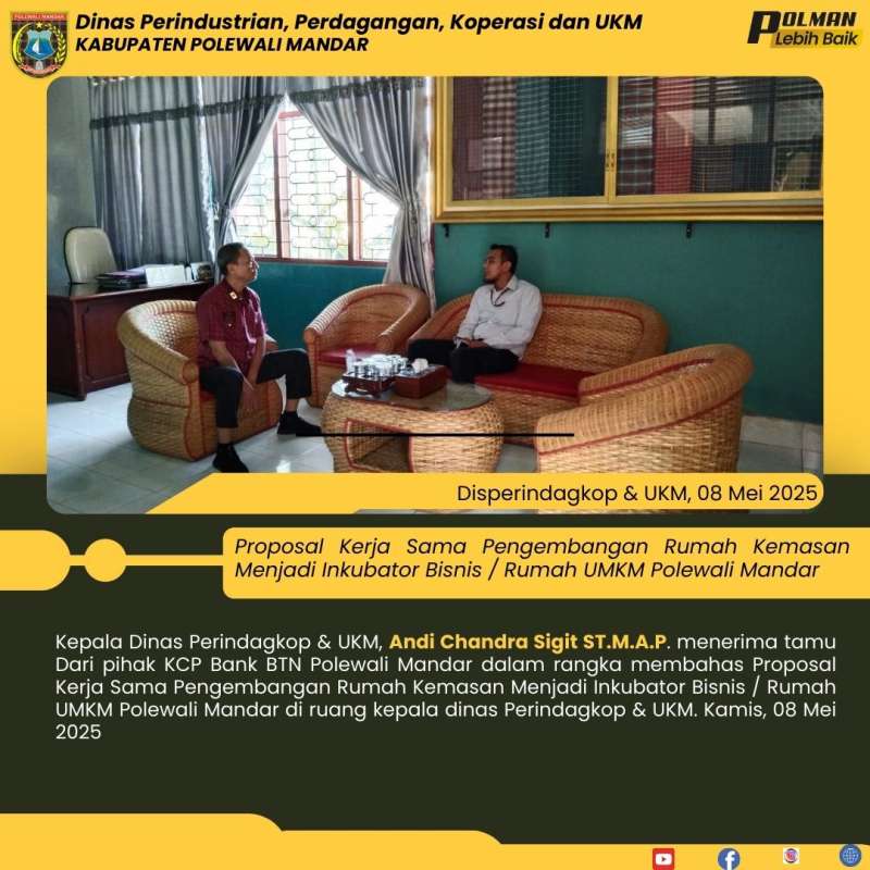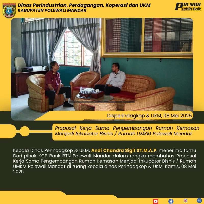 Kepala Dinas Perindagkop & UKM, Andi Chandra Sigit ST.M.A.P. menerima tamu Dari pihak KCP Bank BTN Polewali Mandar dalam rangka membahas Proposal Kerja Sama Pengembangan Rumah Kemasan Menjadi Inkubator Bisnis / Rumah UMKM Polewali Mandar di ruang kepala dinas Perindagkop & UKM. Kamis, 08 Mei 2025