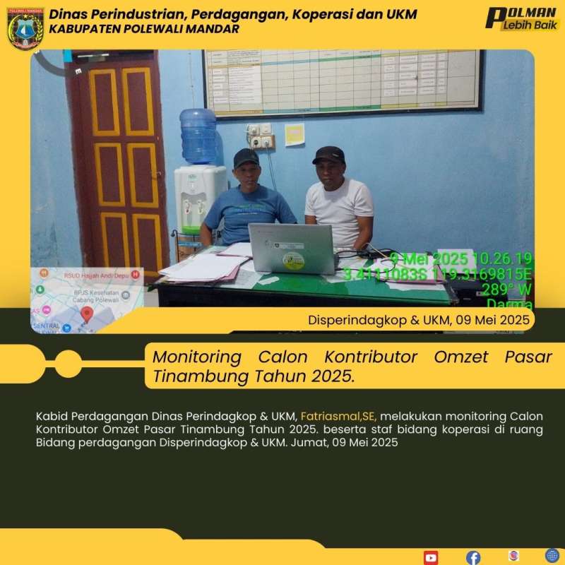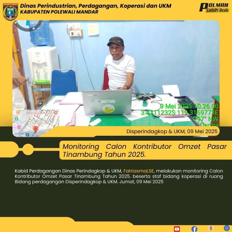 Kabid Perdagangan Dinas Perindagkop & UKM, Fatriasmal,SE, melakukan monitoring Calon Kontributor Omzet Pasar Tinambung Tahun 2025. beserta staf bidang koperasi di ruang Bidang perdagangan Disperindagkop & UKM. Jumat, 09 Mei 2025
