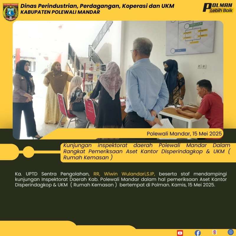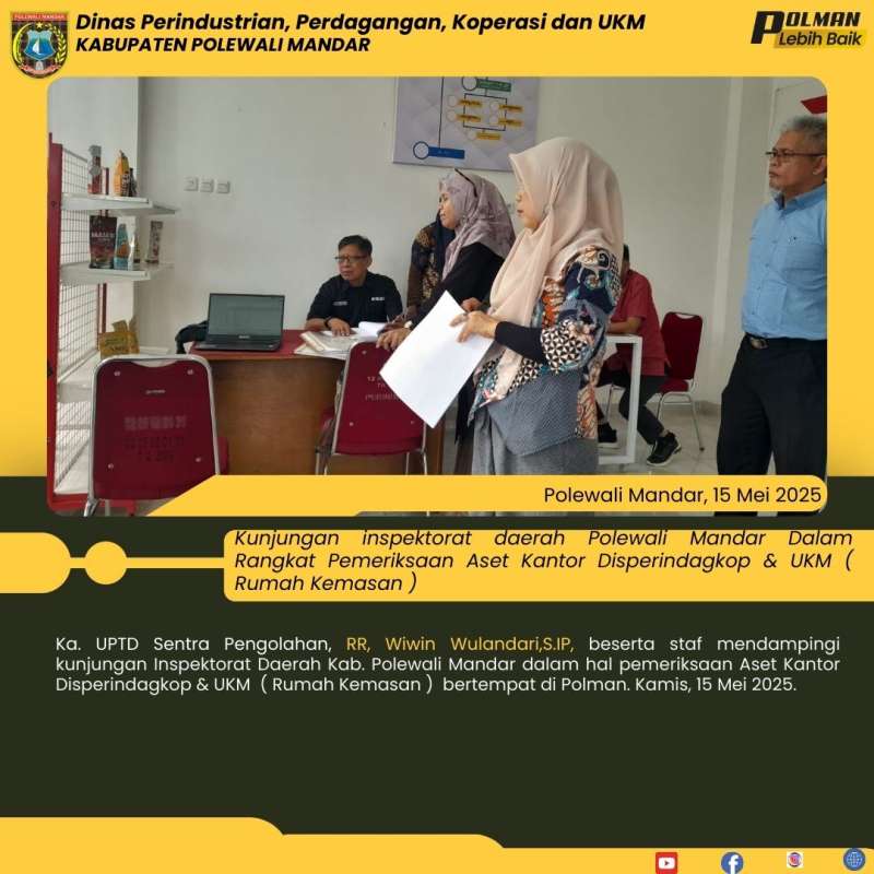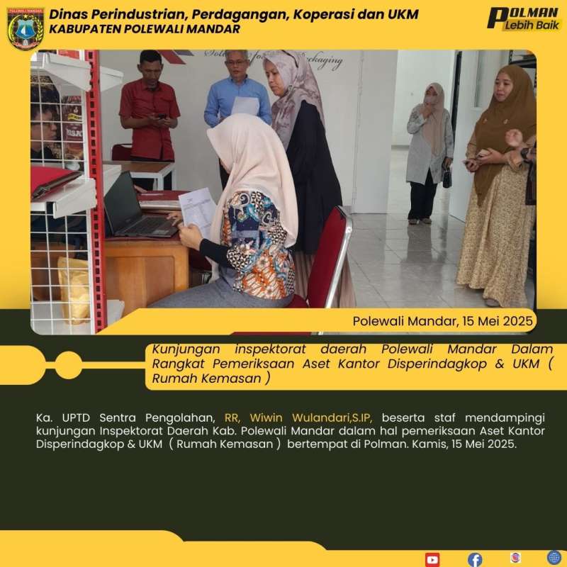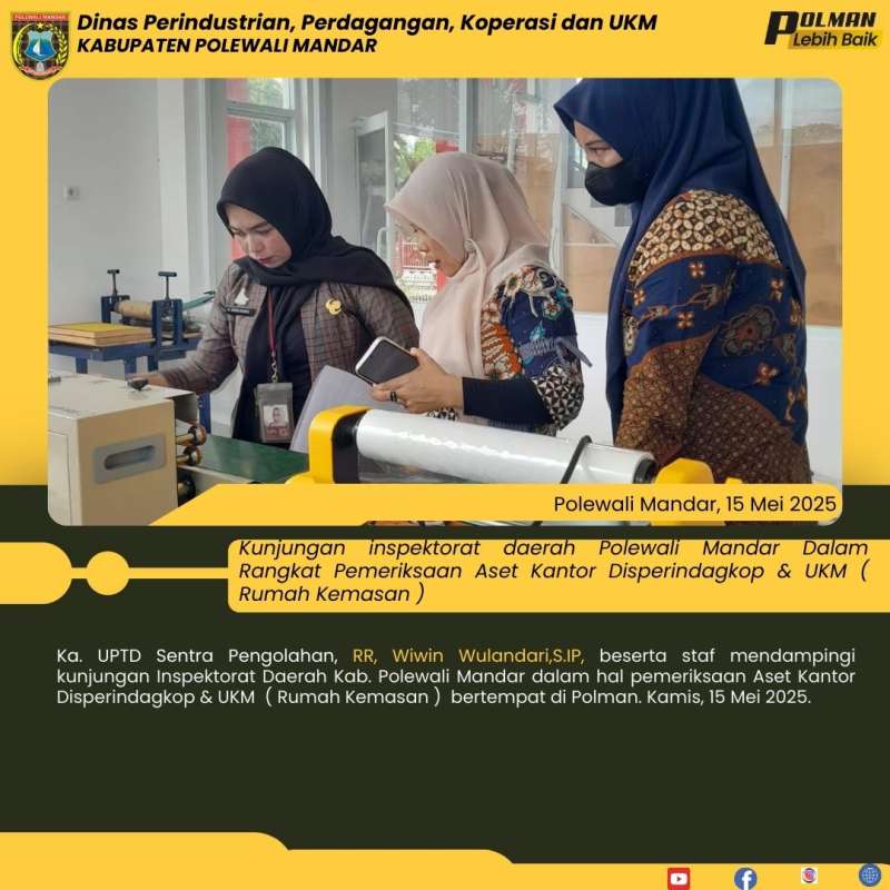 Ka. UPTD Sentra Pengolahan, RR, Wiwin Wulandari,S.IP, beserta staf mendampingi kunjungan Inspektorat Daerah Kab. Polewali Mandar dalam hal pemeriksaan Aset Kantor Disperindagkop & UKM ( Rumah Kemasan ) bertempat di Polman. Kamis, 15 Mei 2025.