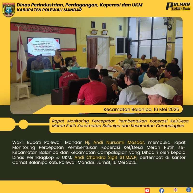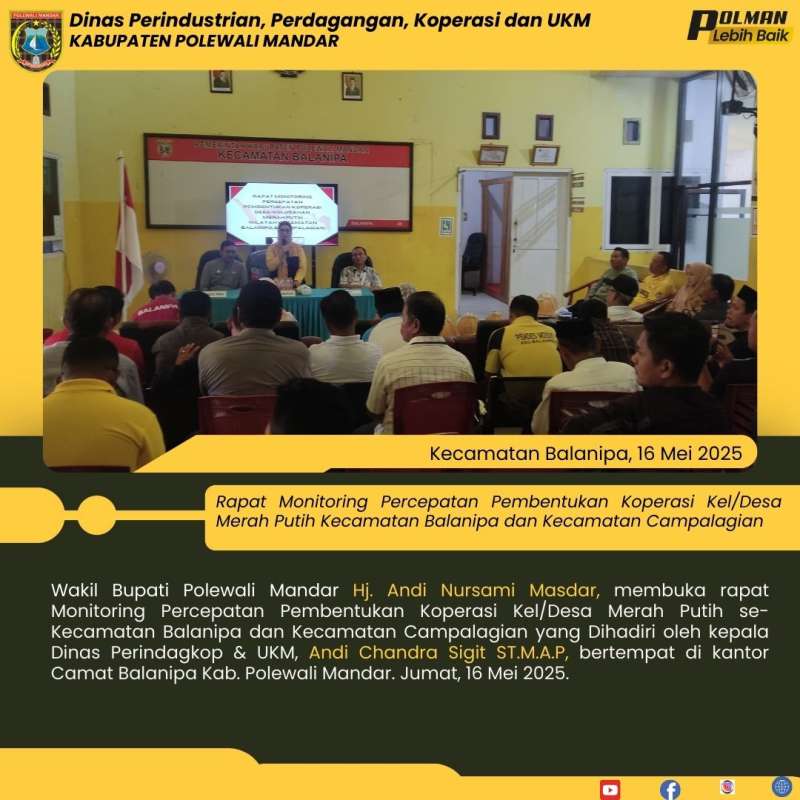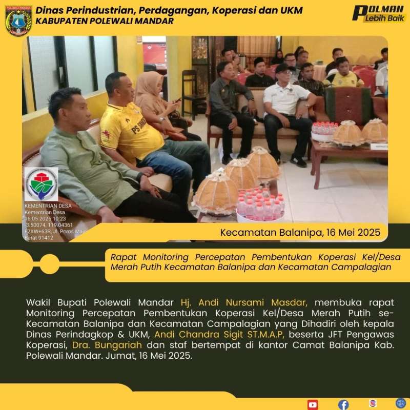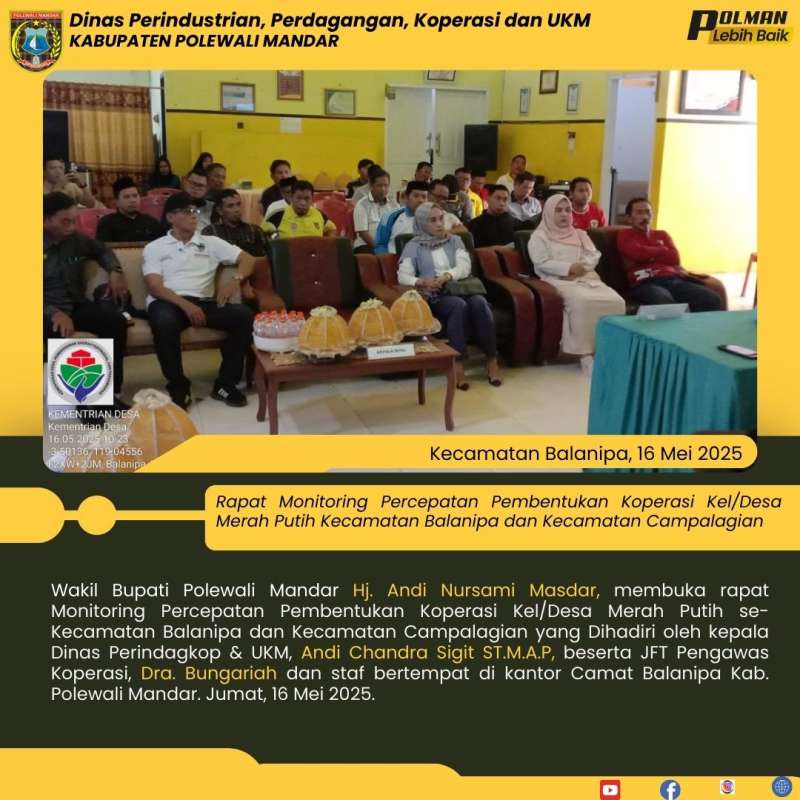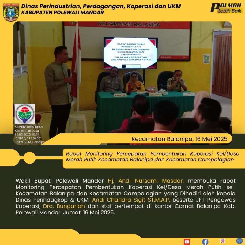 Wakil Bupati Polewali Mandar Hj. Andi Nursami Masdar, membuka rapat Monitoring Percepatan Pembentukan Koperasi Kel/Desa Merah Putih se-Kecamatan Balanipa dan Kecamatan Campalagian yang Dihadiri oleh kepala Dinas Perindagkop & UKM, Andi Chandra Sigit ST.M.A.P, beserta JFT Pengawas Koperasi, Dra. Bungariah dan staf, bertempat di kantor Camat Balanipa Kab. Polewali Mandar. Jumat, 16 Mei 2025.