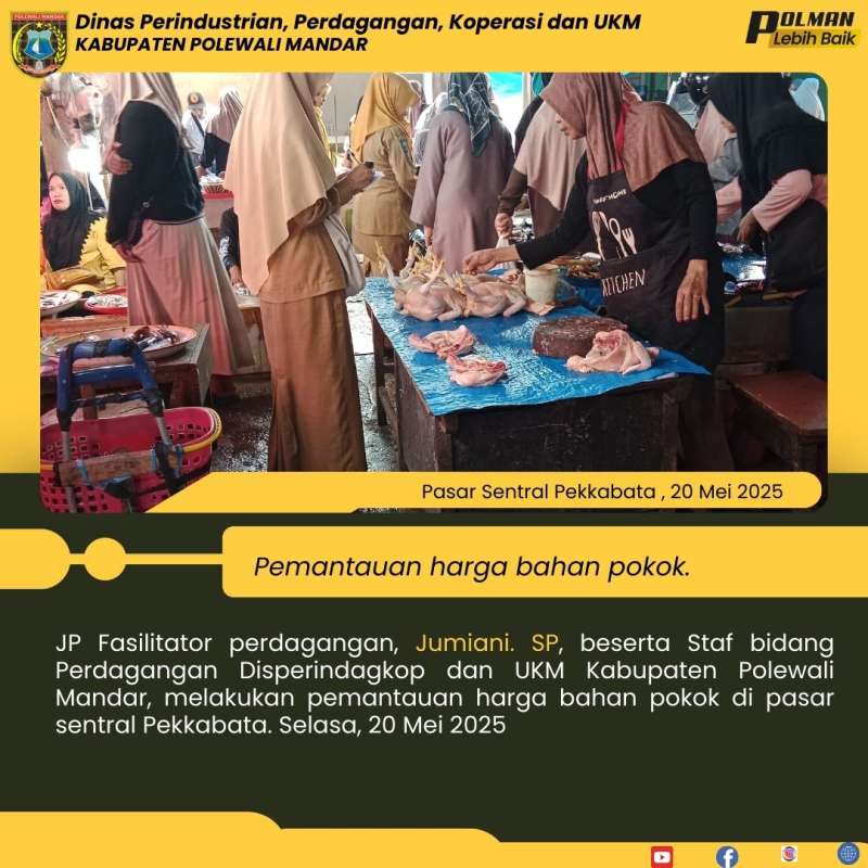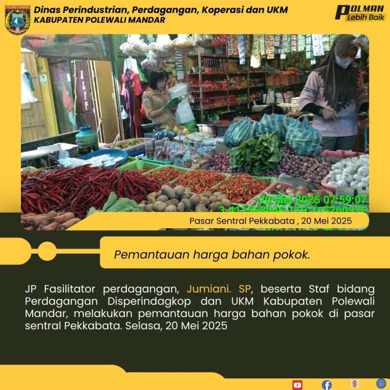 JP Fasilitator perdagangan, Jumiani. SP, beserta Staf bidang Perdagangan Disperindagkop dan UKM Kabupaten Polewali Mandar, melakukan pemantauan harga bahan pokok di pasar sentral Pekkabata. Selasa, 20 Mei 2025